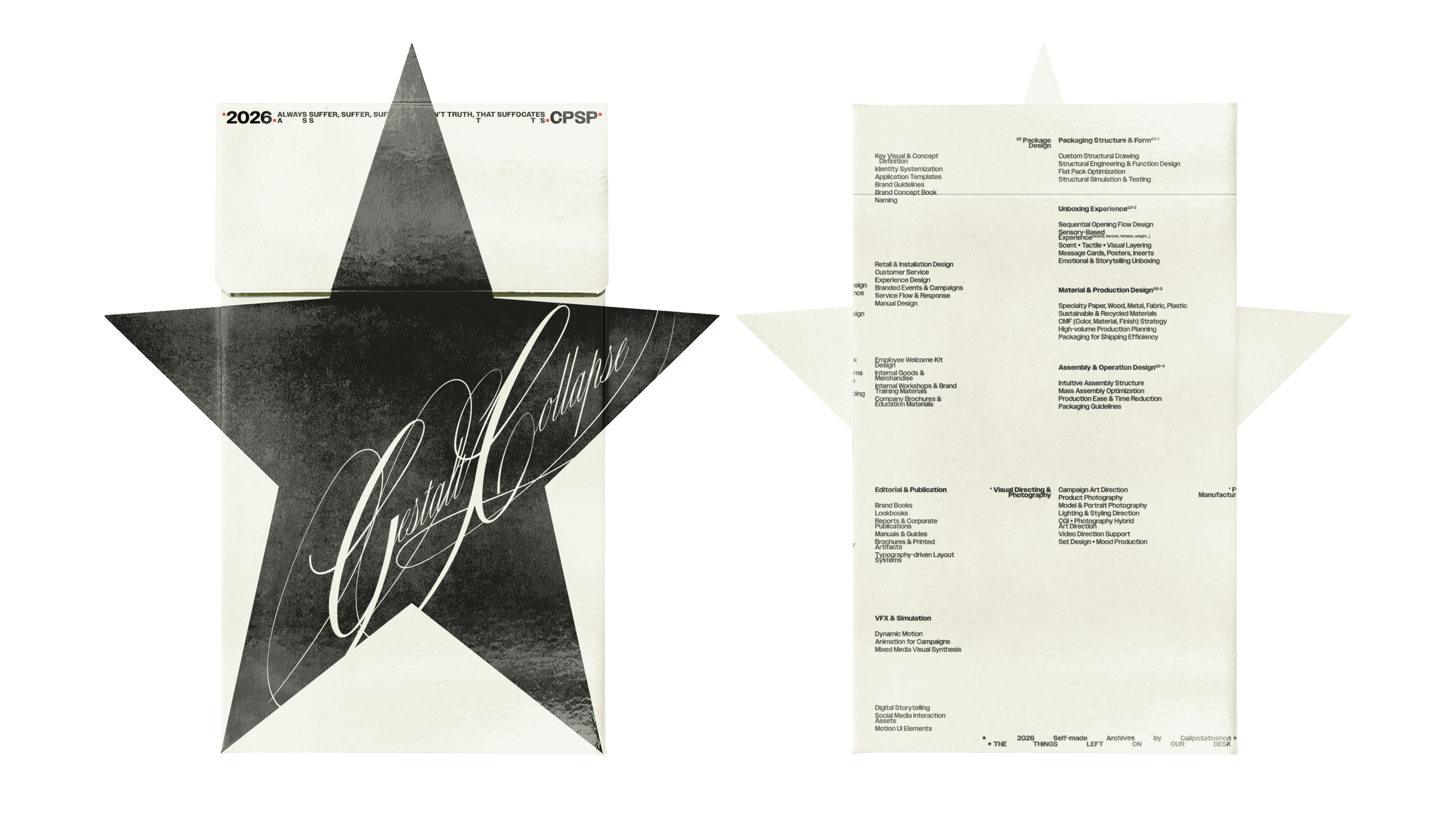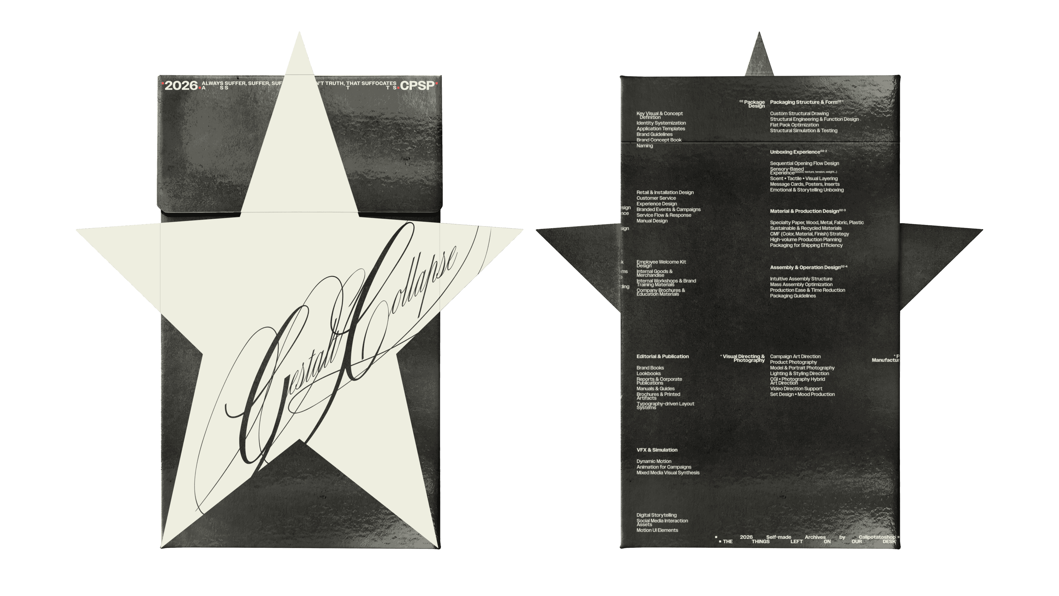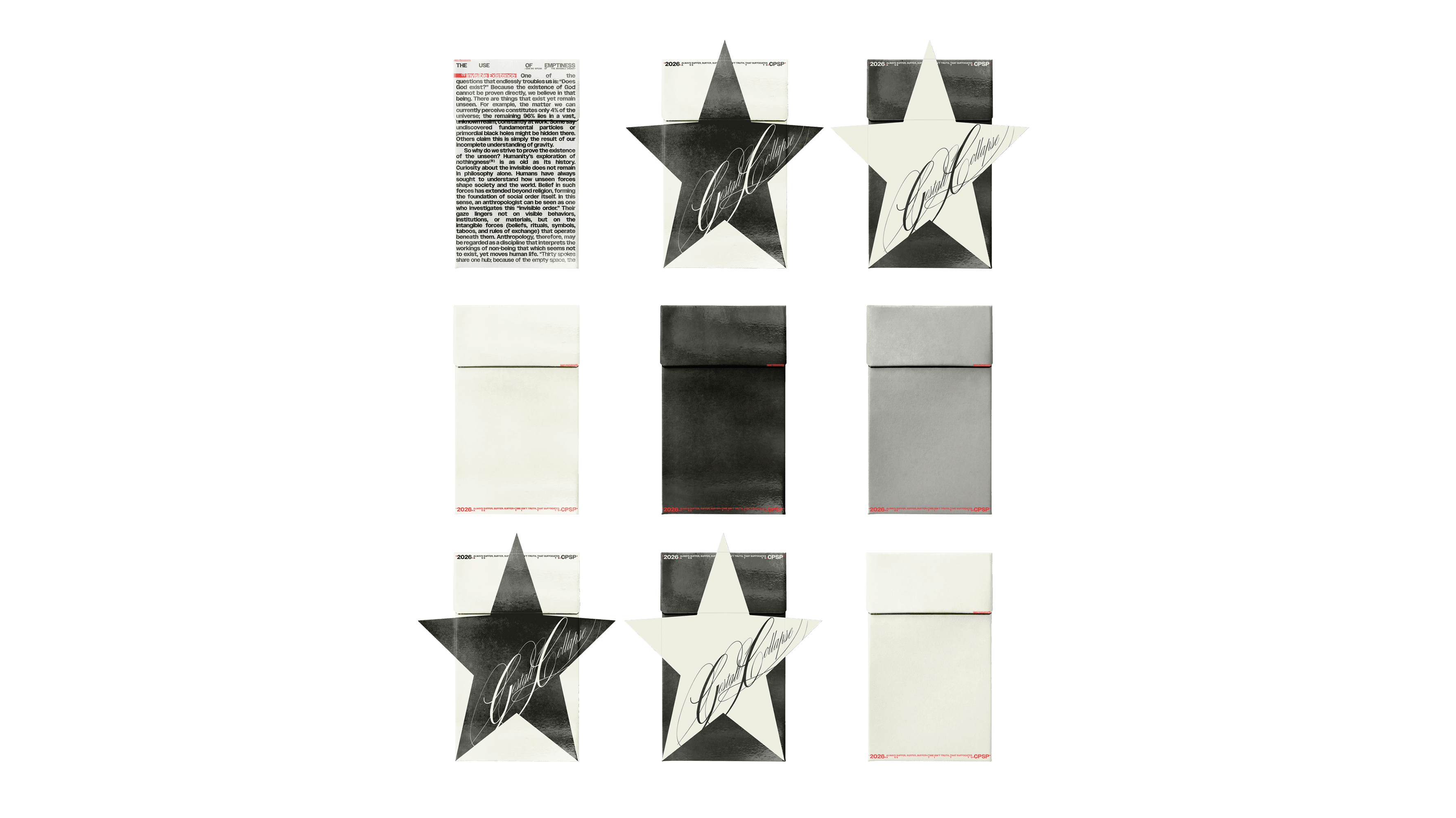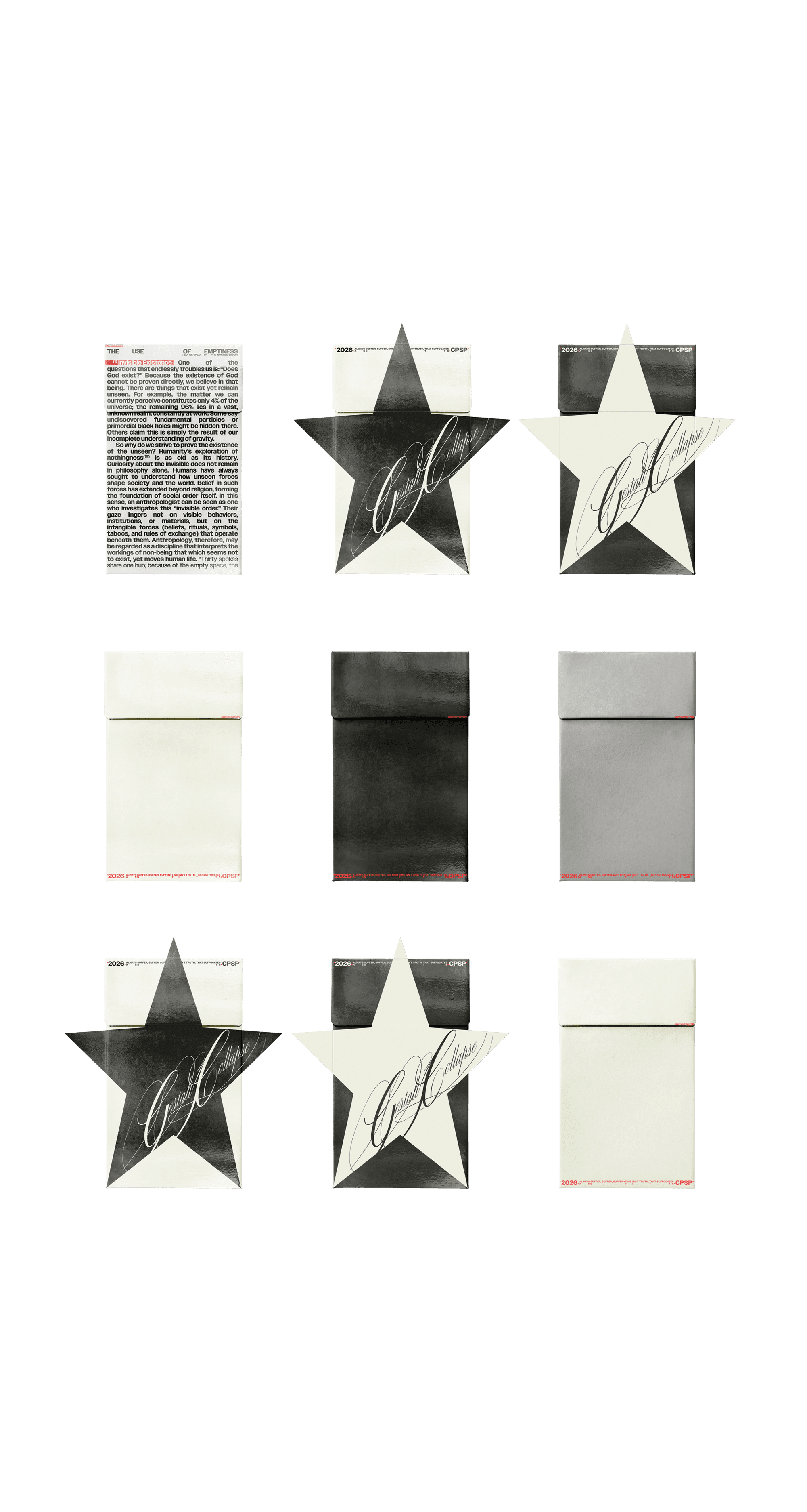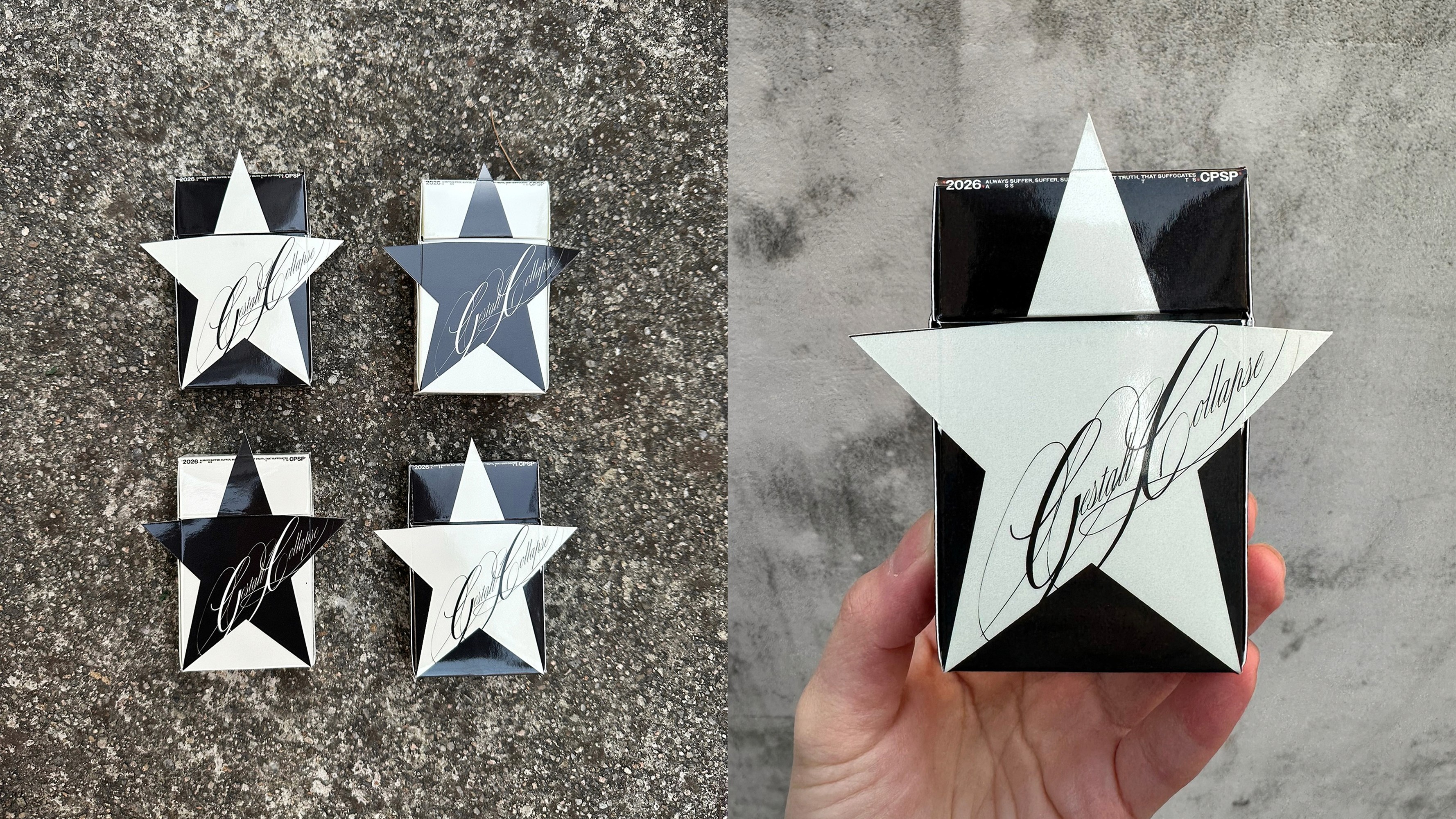 Some packages feature a star shaped die cut applied to the front panel. Alongside this, we introduced the Gestalt Collapse typography. This type design is characterized by curved strokes with alternating slant, thin and thick weights, creating a sense of visual tension and movement.