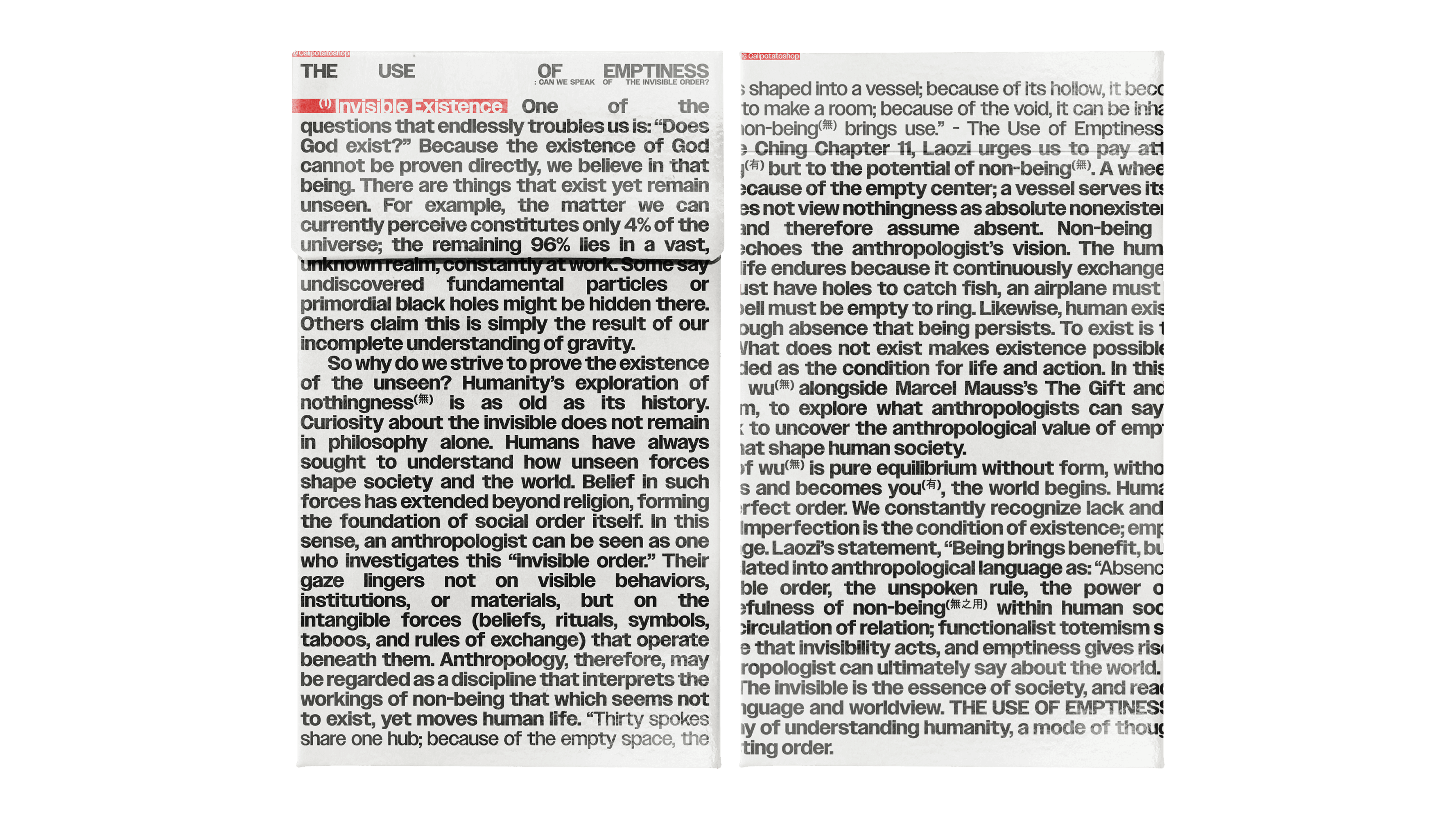 The text printed on the package below, which contains a large amount of written content, is taken from a short essay titled 『THE USE OF EMPTINESS』, written by the director of Calipotatoshop. The essay reflects on the concepts of non being and being, drawing from 《Tao Te Ching (道德經)》, Chapter 11 (無之用) by Laozi. An excerpt from the original essay is provided below.