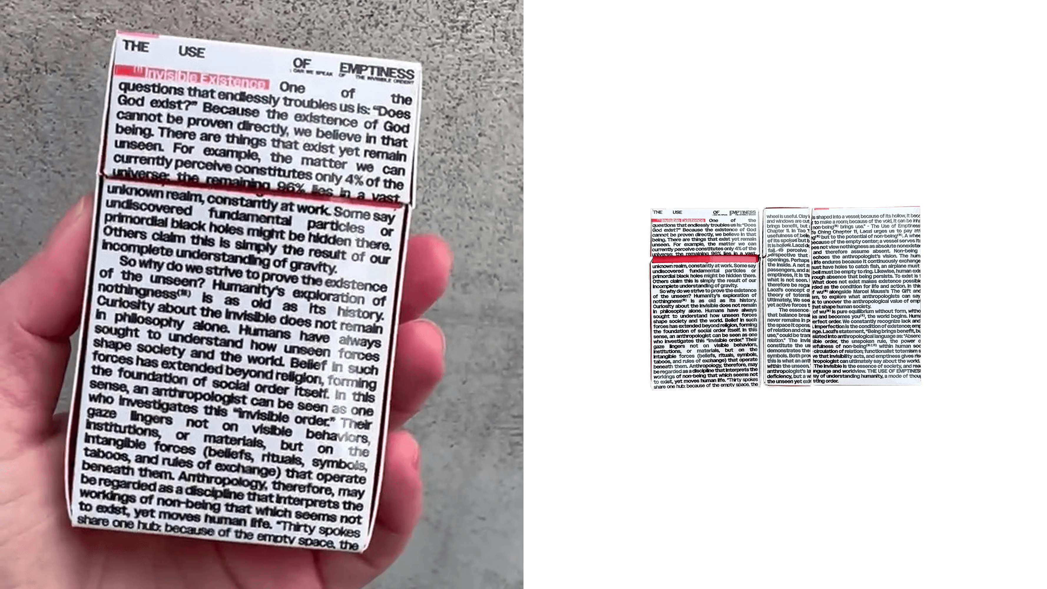 Humans live among invisible things. The invisible is the essence of society, and reading those gaps shapes our language and worldview. THE USE OF EMPTINESS is a way of understanding humanity, a mode of thought for interpreting unseen order.