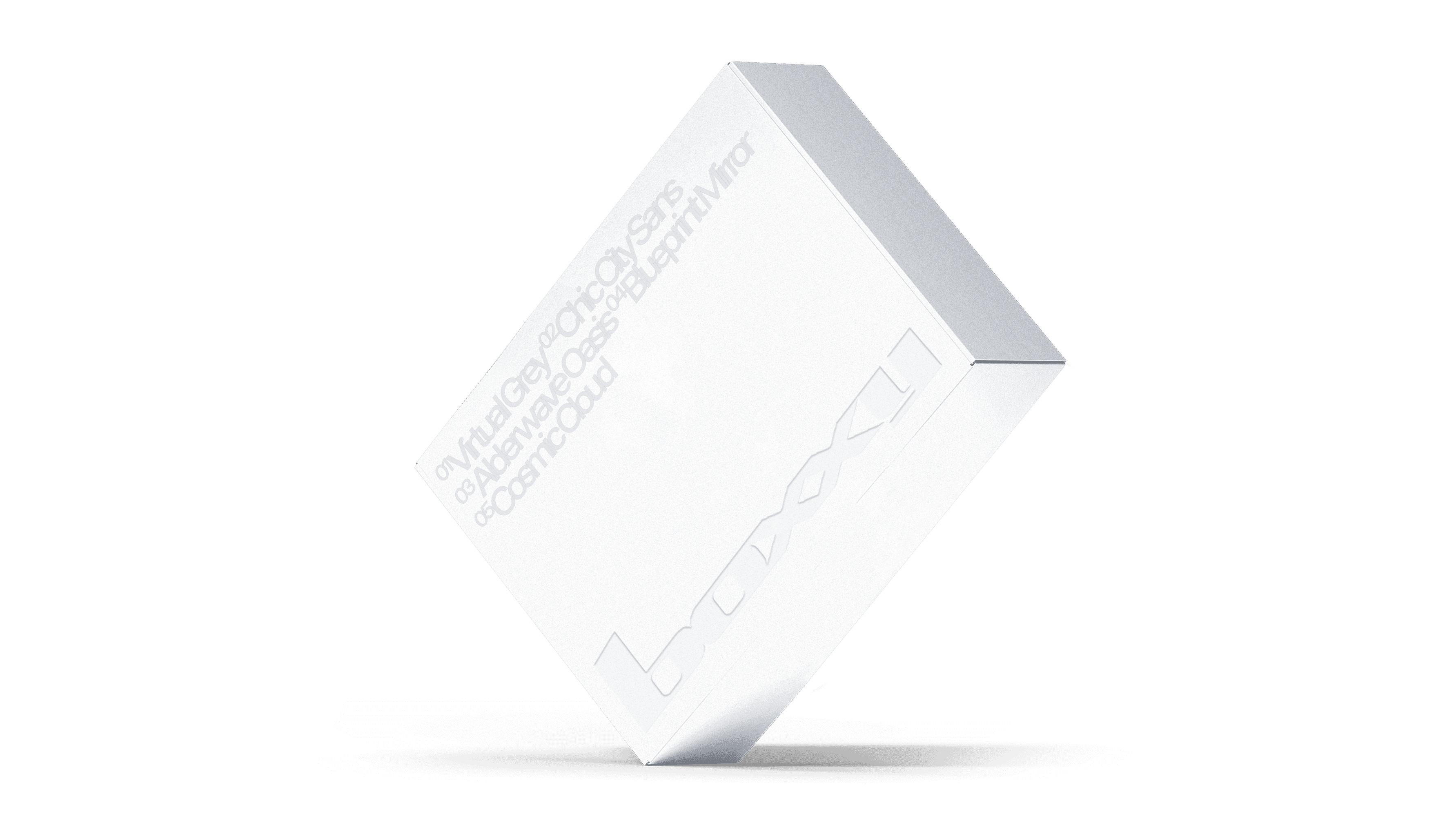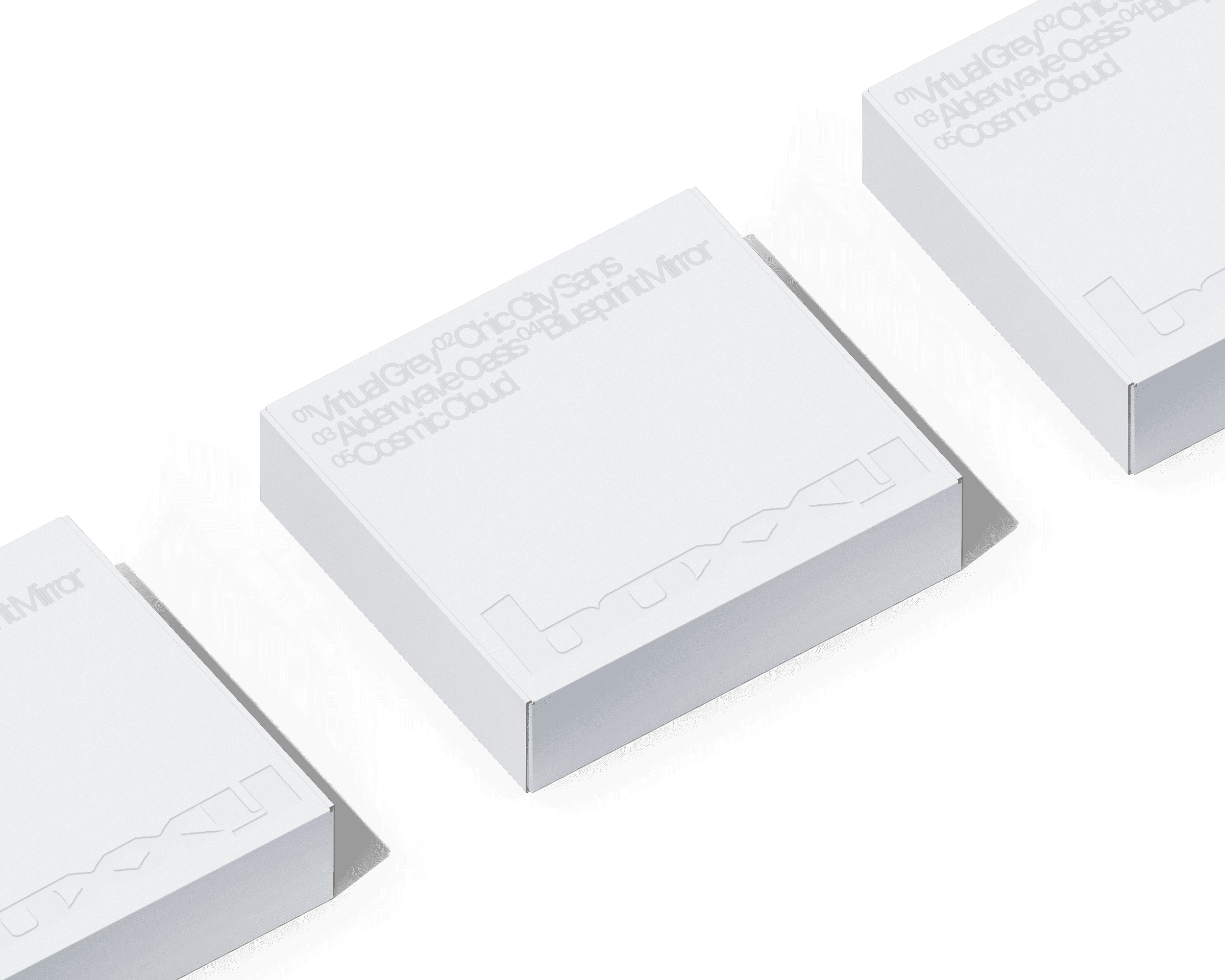 The BOXXY package is designed as a horizontal rectangular hard box. The exterior uses a single light grey tone, with a consistently finished surface and no excessive coating. The BOXXY logo is placed prominently on the top, printed with low contrast so it appears subtle rather than dominant.