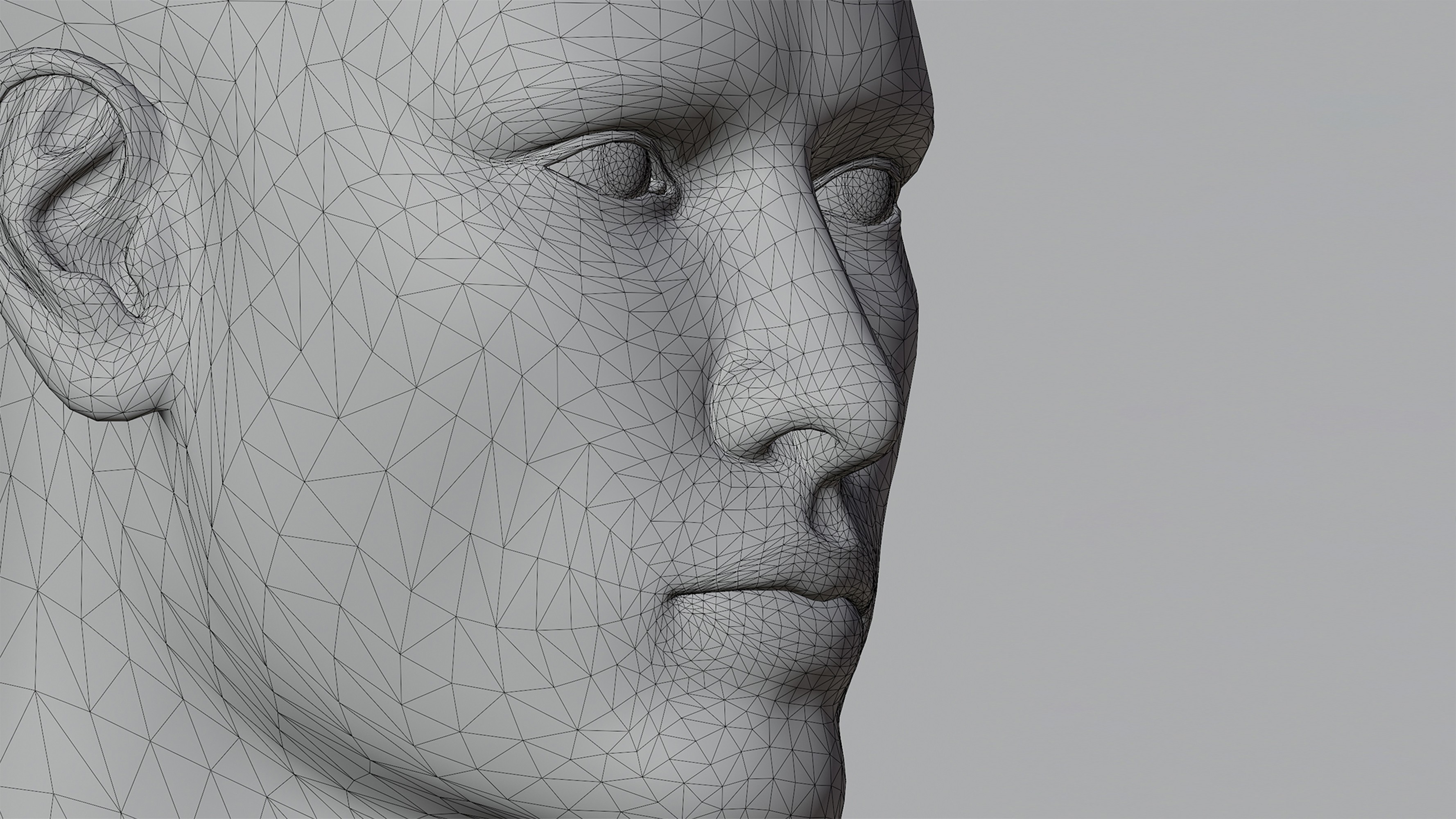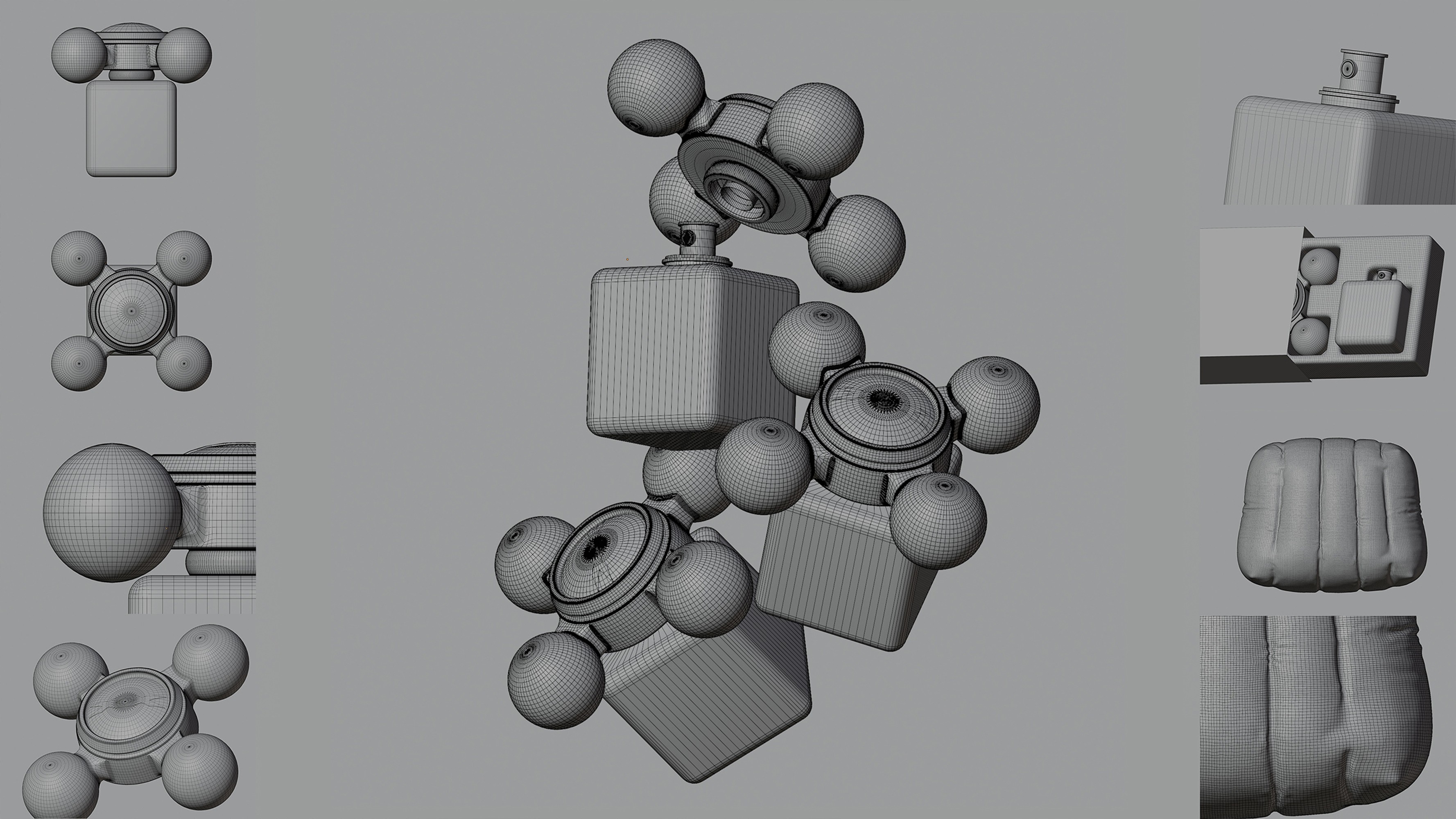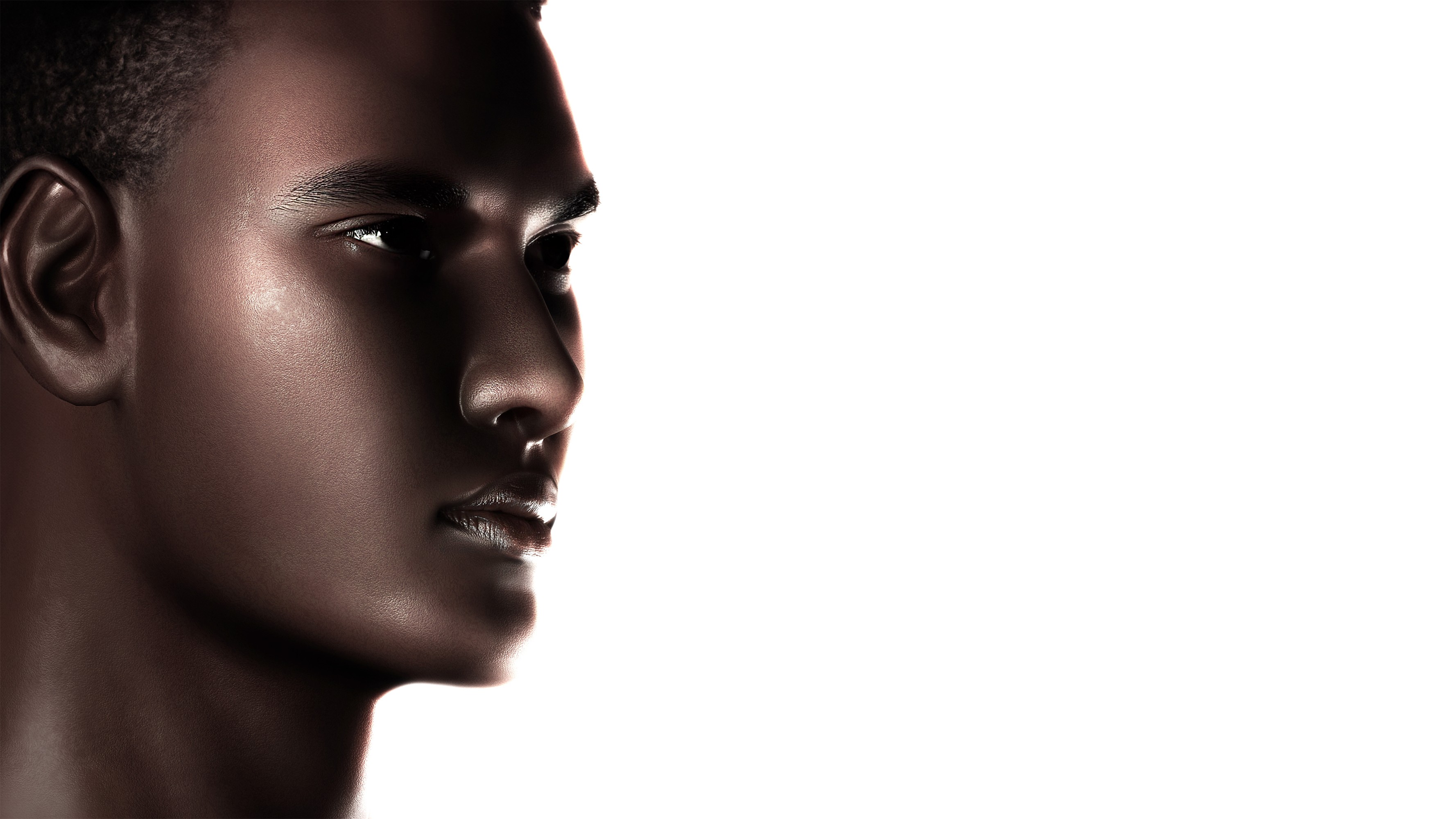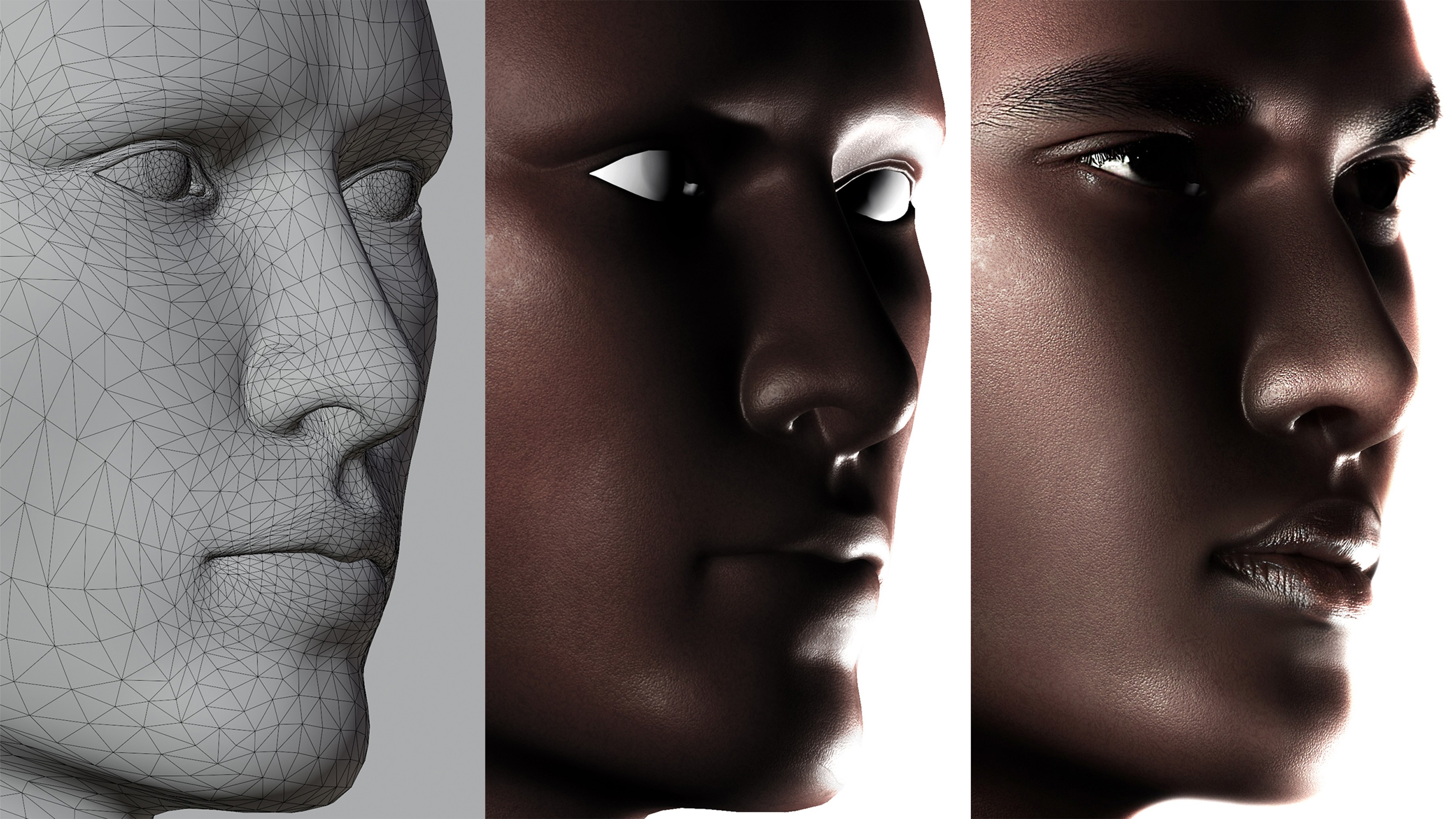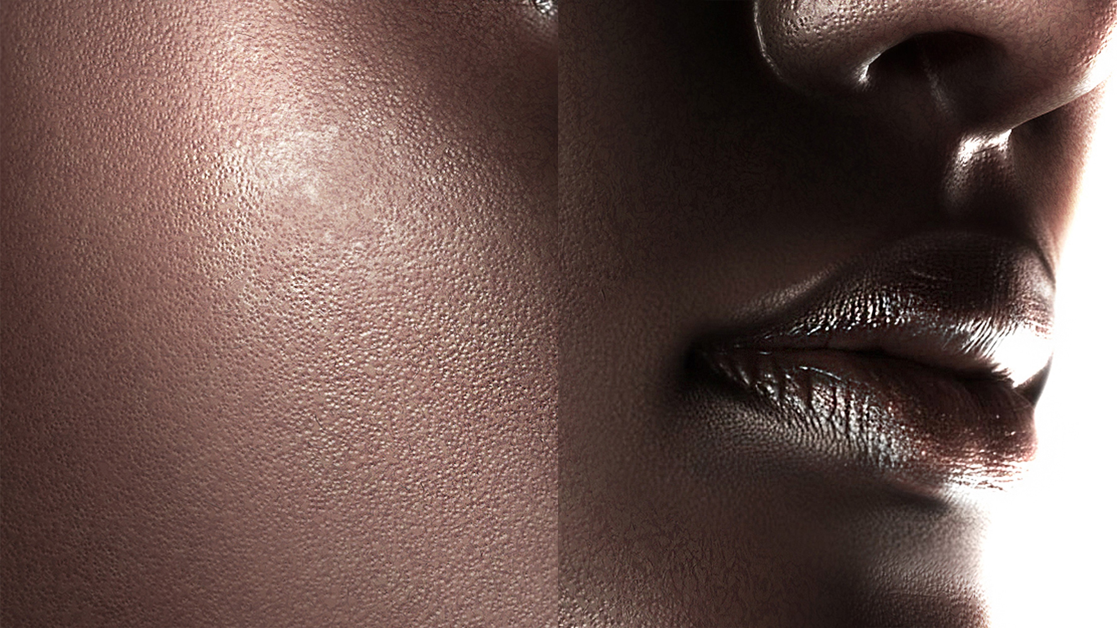 Human model & products scenes were created through 3D modeling. From the modeling stage, the wireframe structure was organized alongside the final form to clearly reveal the facial shape, volume, and surface topology. In the final render, the focus was placed on skin surface detailing. The shader was configured around pore density, subtle surface irregularities, and highlight distribution around the lips and nose, resulting in a texture that closely resembles real skin.