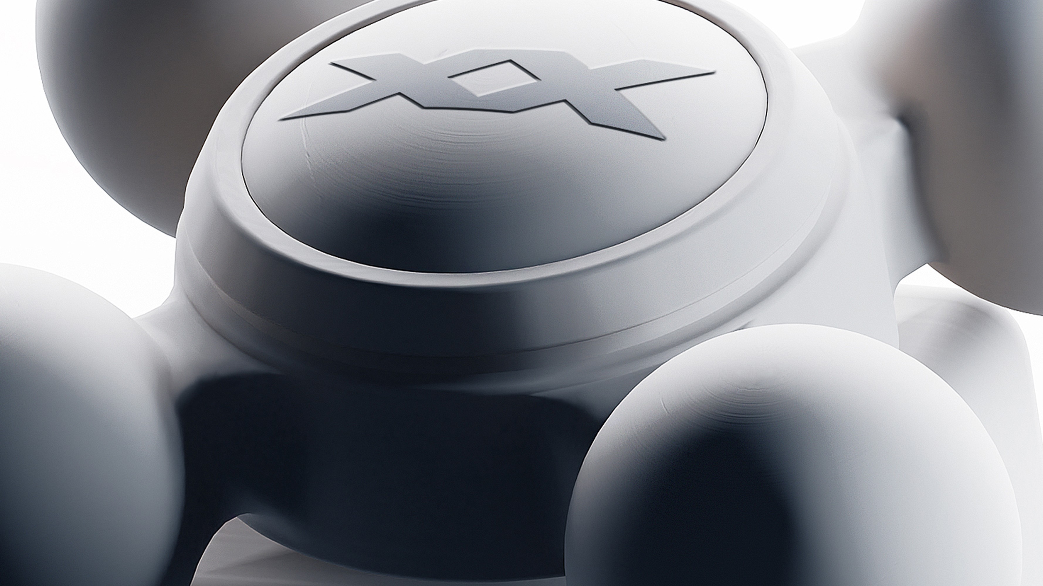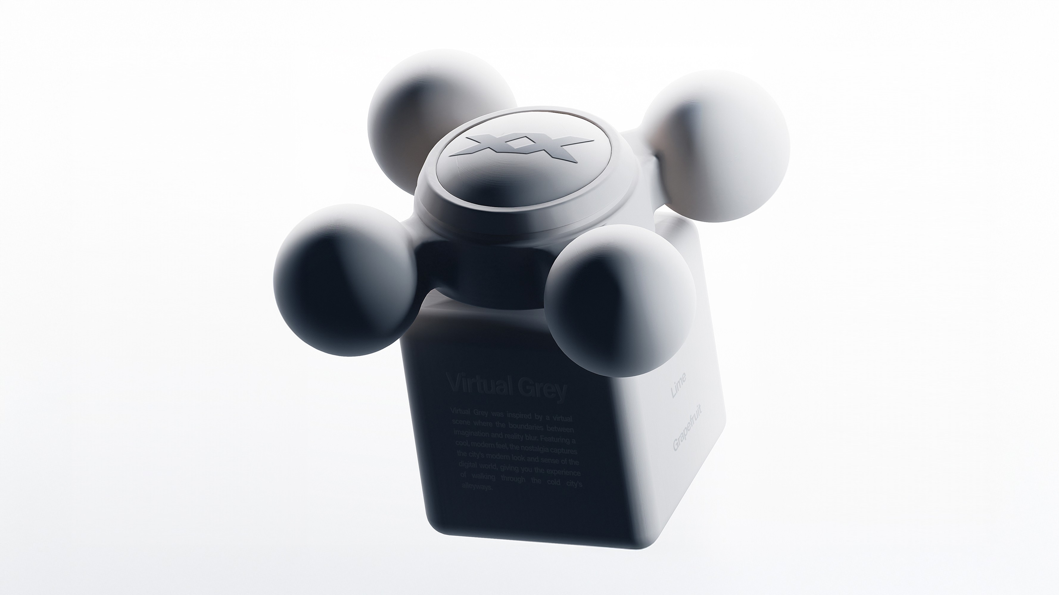The BOXXY perfume bottle is composed of a rounded cube shaped body and a cross shaped cap. The edges of the bottle are designed with soft, rounded curves, creating a smoother and more gentle impression that leans toward a futuristic image rather than a purely modern one. The surface features a matte finish, chosen with tactile comfort in mind when held by hand. The fragrance name and description are engraved directly onto the surface of the bottle. The cap is structured around a cylindrical central core, with four identical spherical forms arranged in a cross layout. Each sphere is positioned at an equal distance from the center, forming a clearly balanced and symmetrical structure across both vertical and horizontal axes. An embossed BOXXY logo is applied to the top center of the cap.