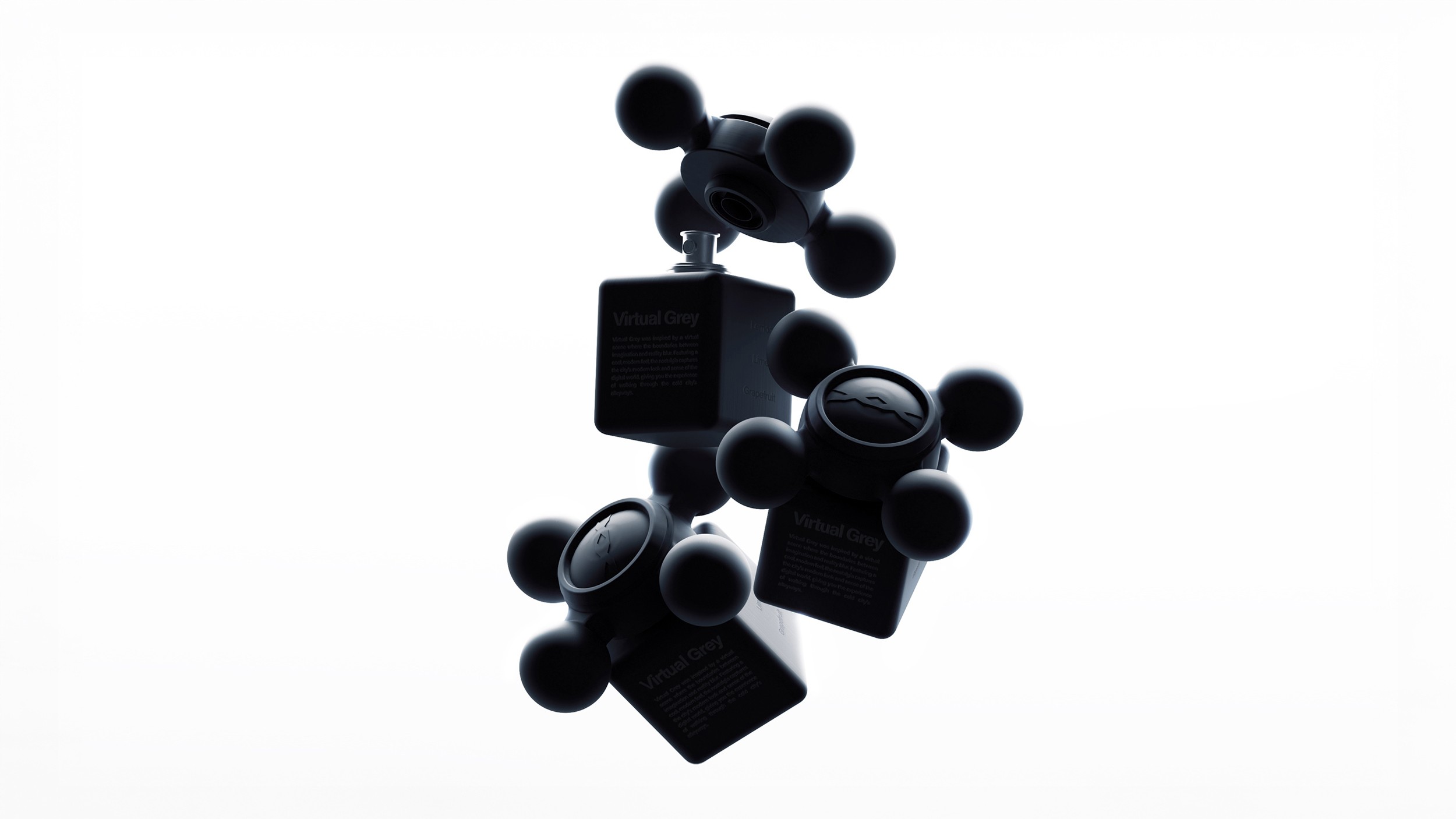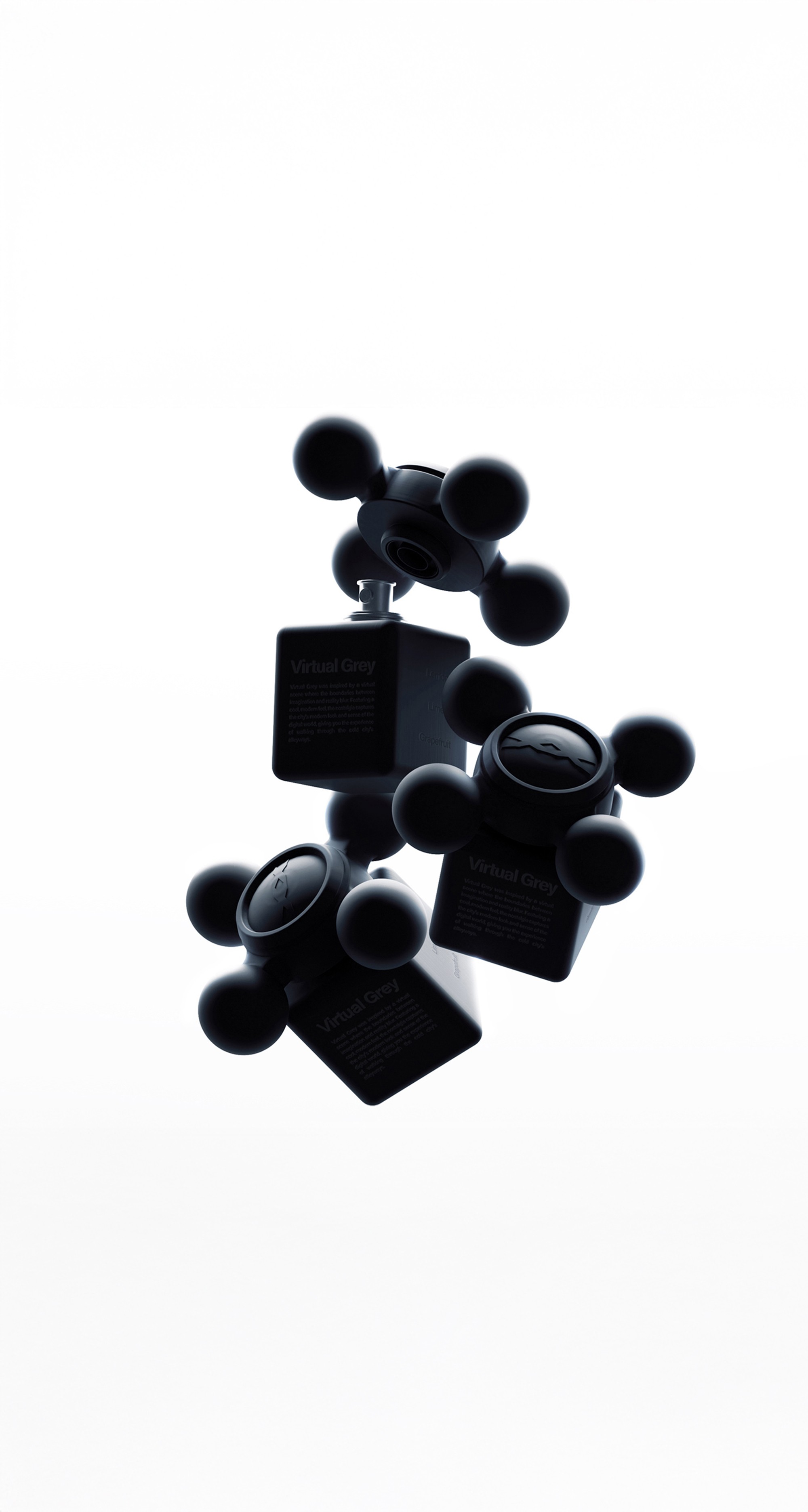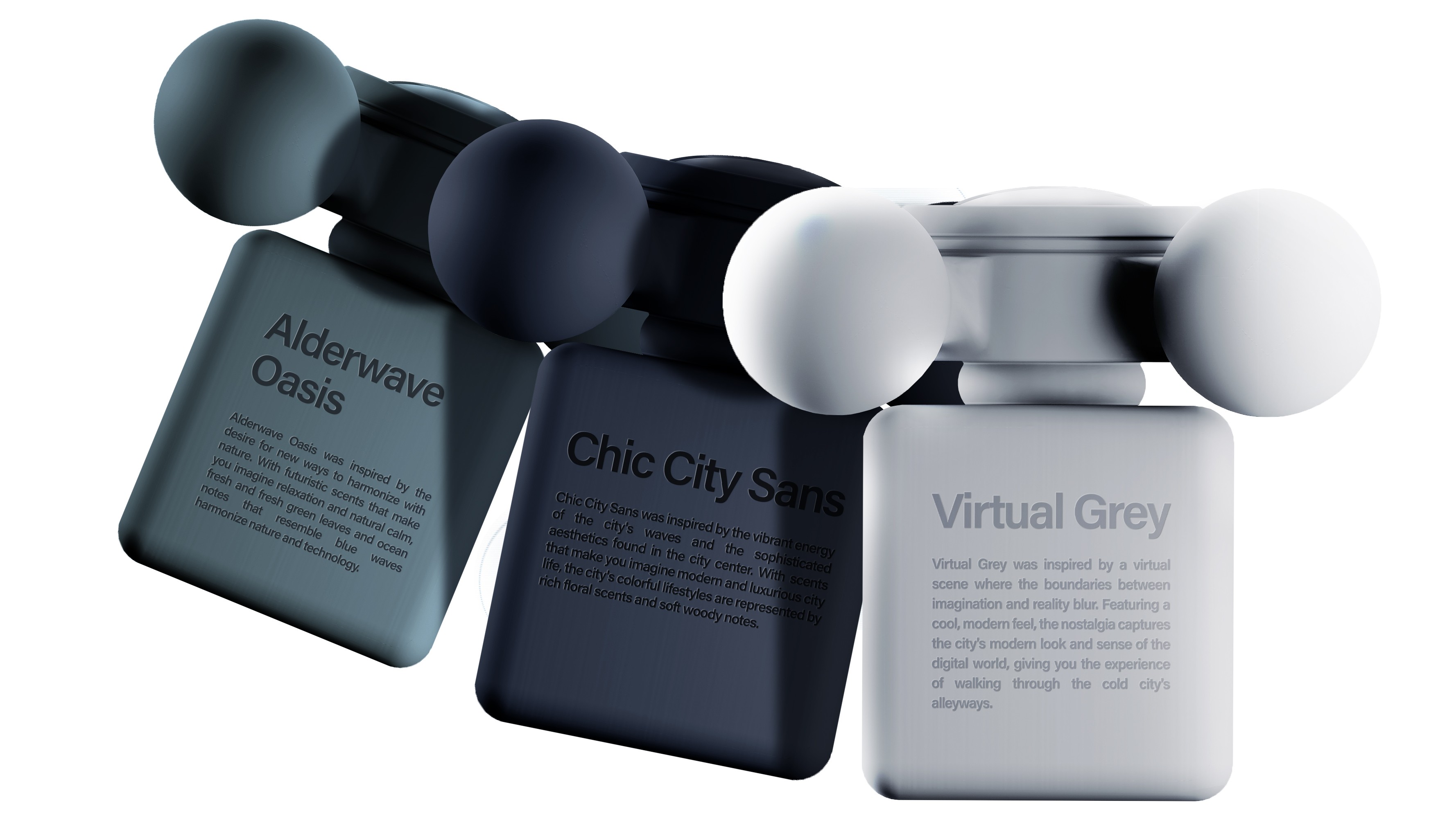 The lineup consists of 5 fragrances, each distinguished by color. A grey to blue tone palette is used, resulting in an overall cool toned composition. The bottle and cap share the same color for each scent, allowing the design to appear unified and minimal when displayed.