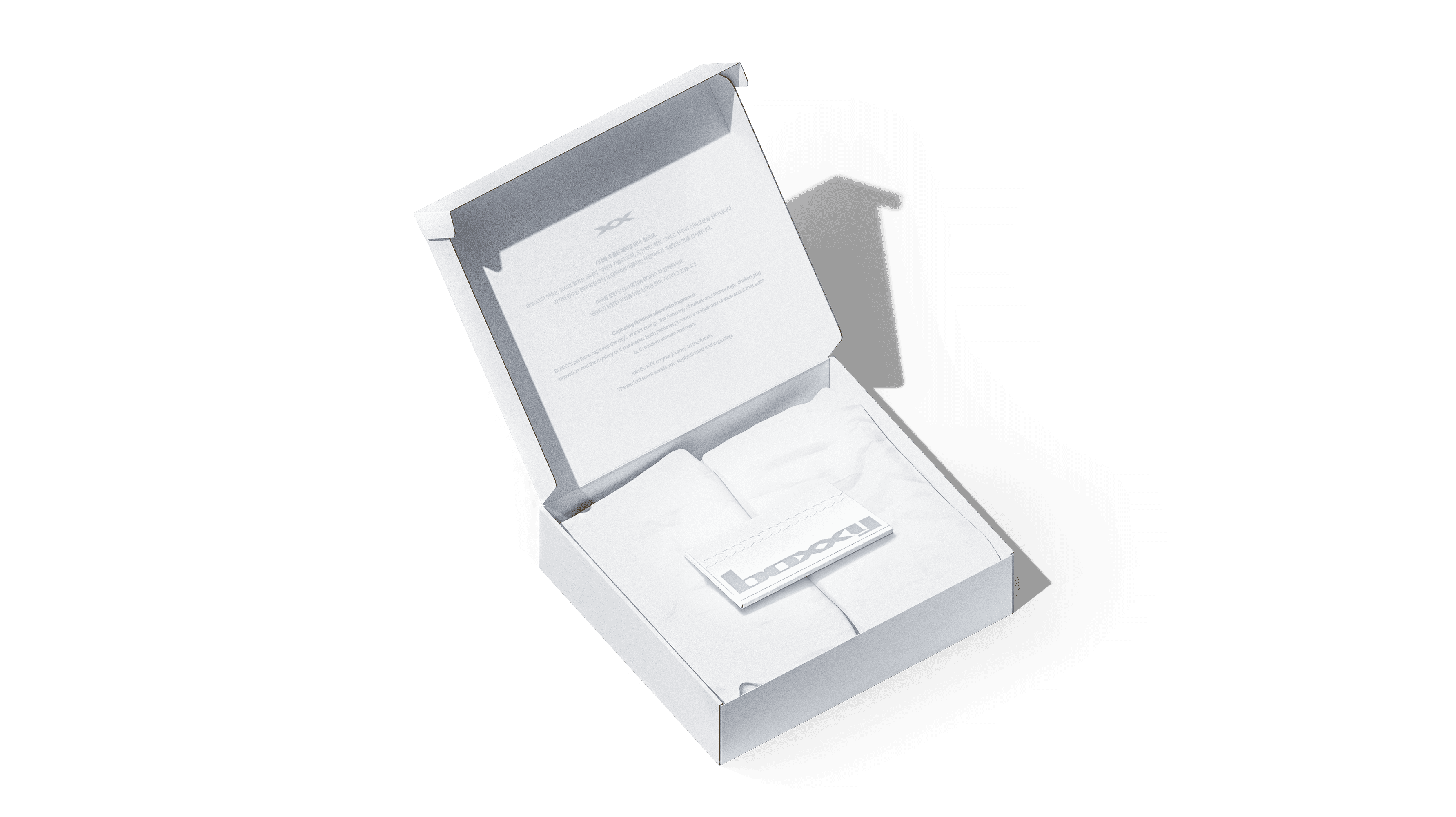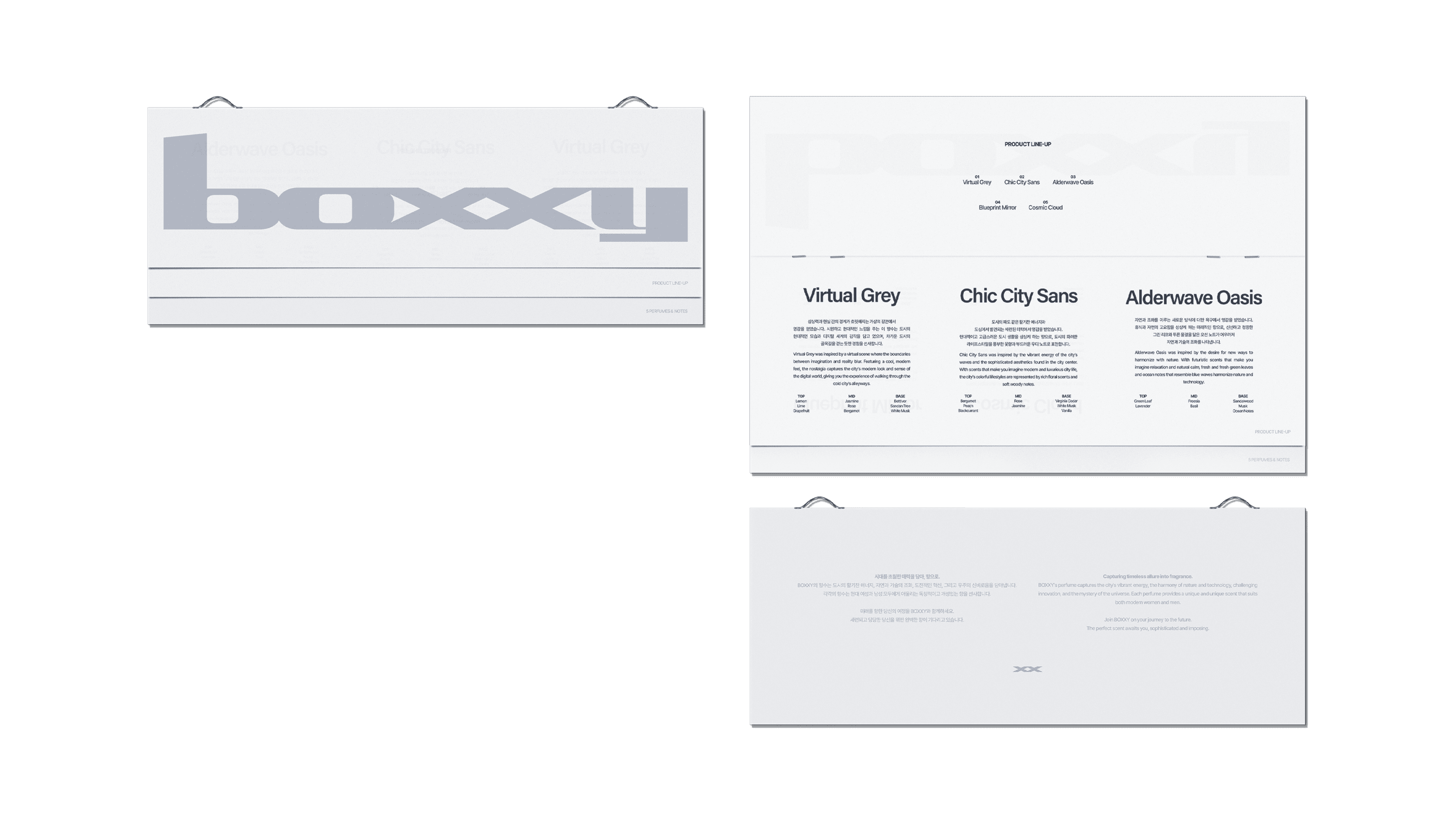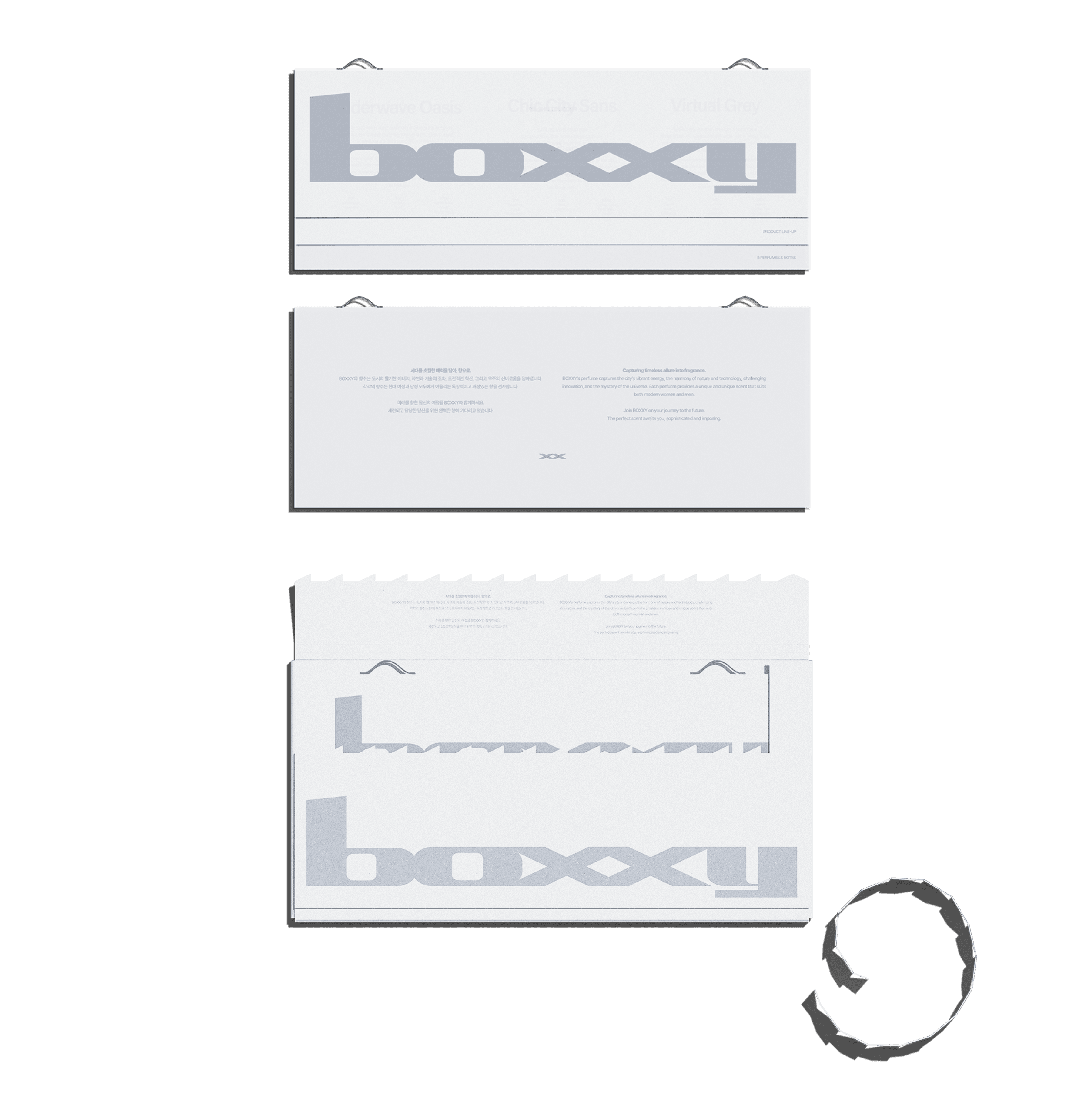 The front features a large BOXXY logo, printed on light grey paper stock. Color usage is kept to a minimum, with the layout relying on text and whitespace to maintain consistency with the overall minimal direction of the BOXXY packaging. Inside, the names of each fragrance, their descriptions, and note compositions are clearly organized. A balanced layout allows multiple scents to be compared within a single sheet. The outer sleeve includes a perforated tear line, adding a physical opening action that enhances the unboxing experience and provides a sense of satisfaction for the user.