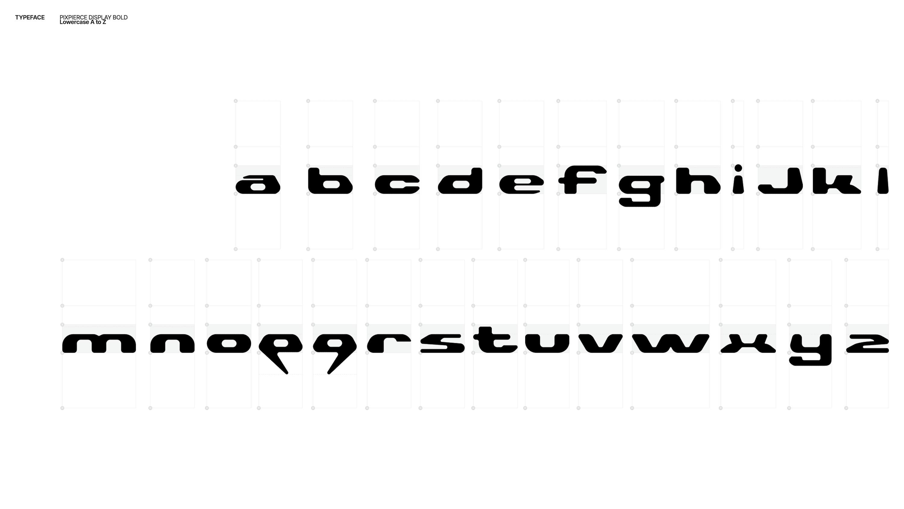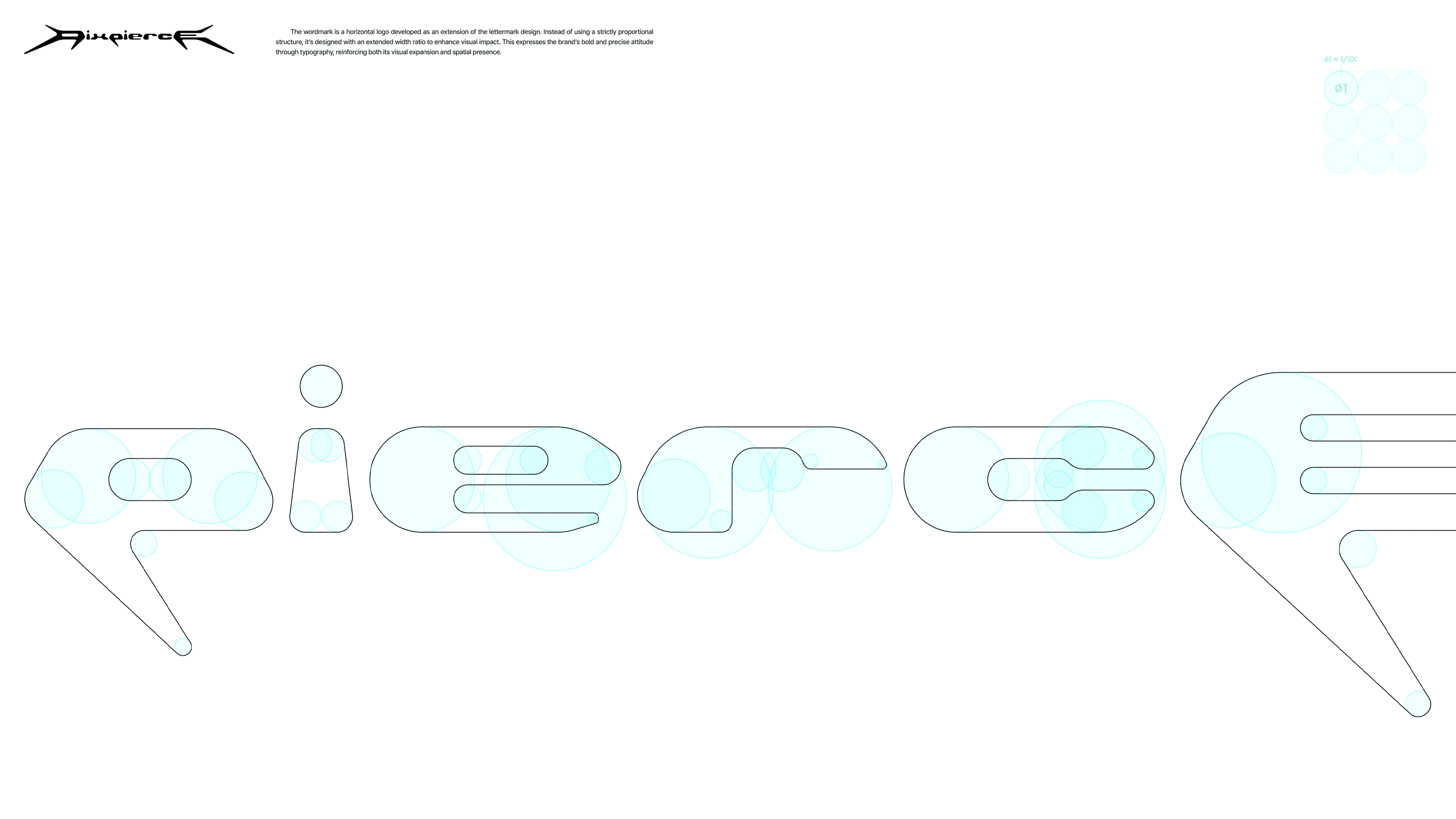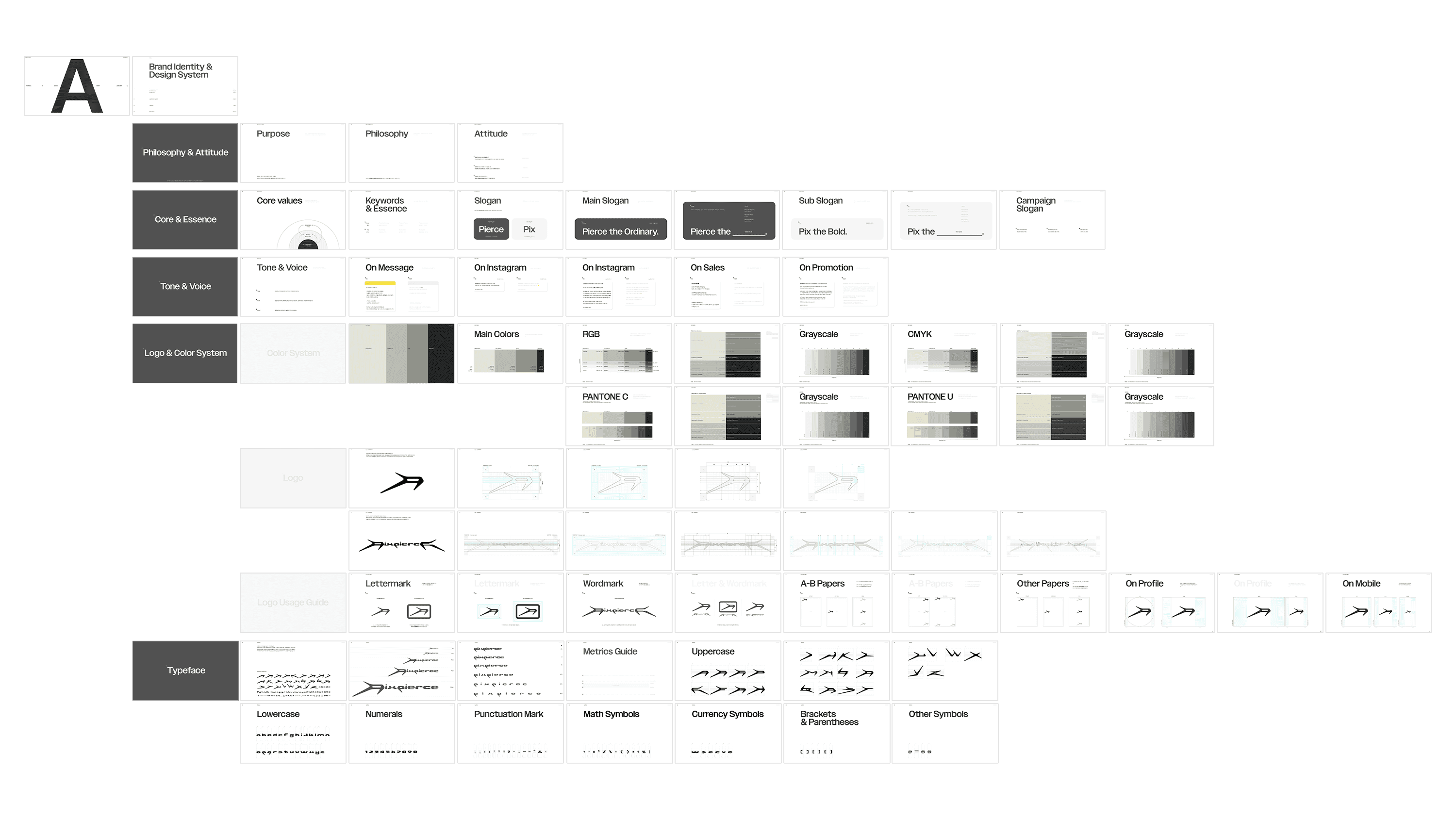 The custom typeface Pixpierce-Display Bold is an expanded logotype-based font that applies the structural logic of the lettermark. The typeface focuses on directionality and momentum rather than stable symmetry, removing unnecessary curves to emphasize the raw energy of straight lines. It is the brand asset that most directly communicates PIXPIERCE’s attitude.