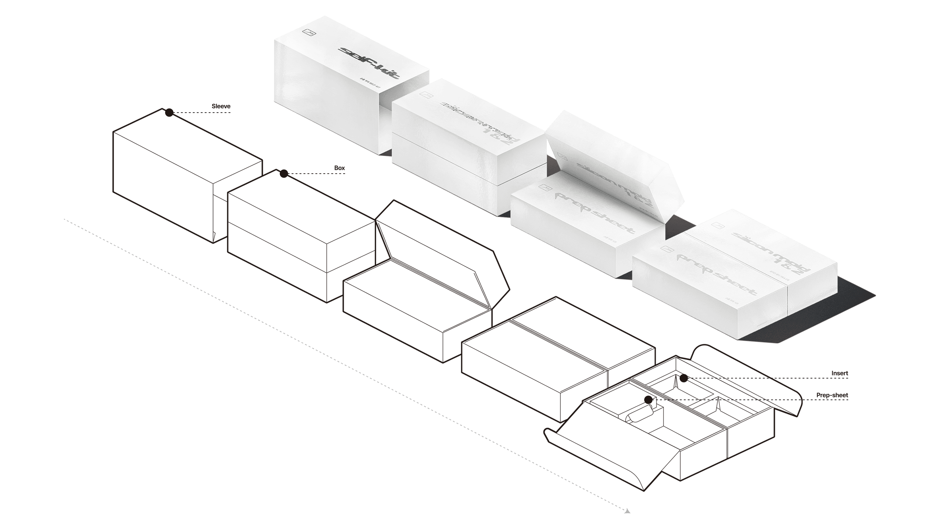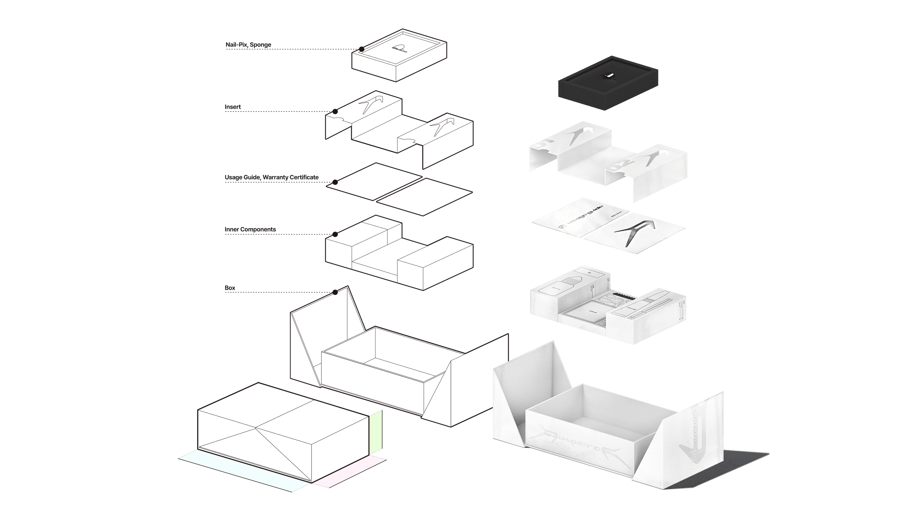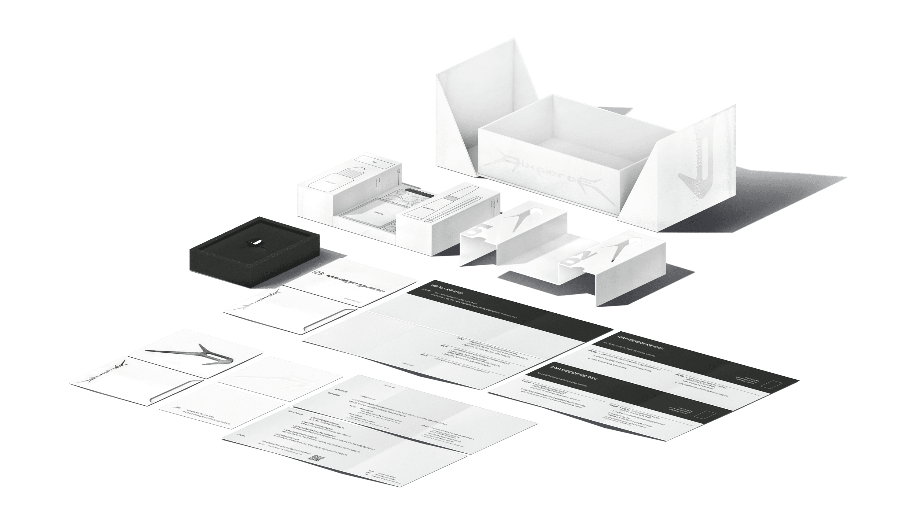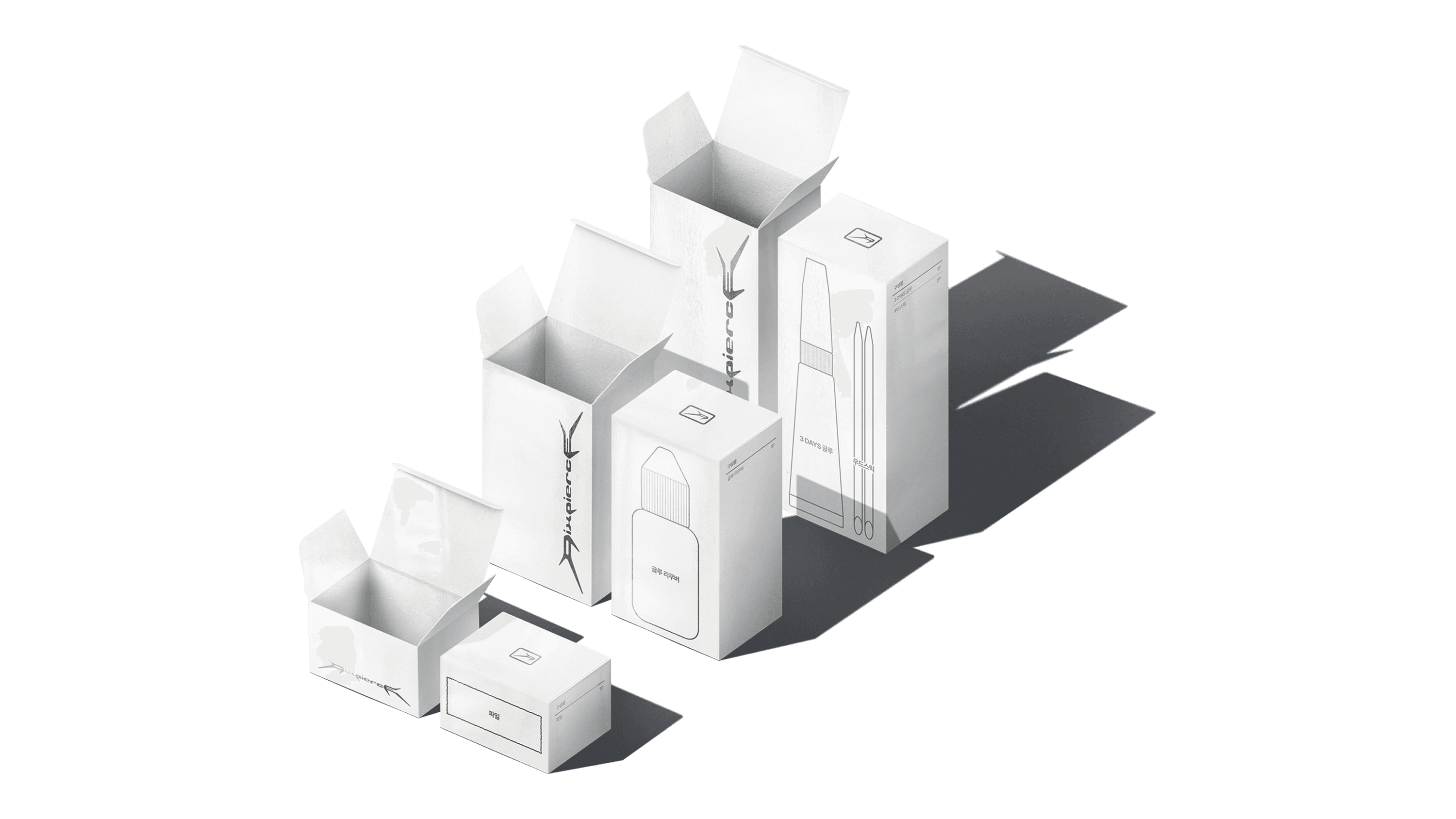 While the first step of BI and design system development deeply explored PIXPIERCE’s attitude, the second step focused on improving storage methods of existing packages and designing new structures that translate into real customer experience. The core of package system design was to utilize limited space efficiently to store all components, while allowing users to easily understand how to use them. This resulted in two types of packages. The packages received by the customer consist of a first and second package, totaling two types.