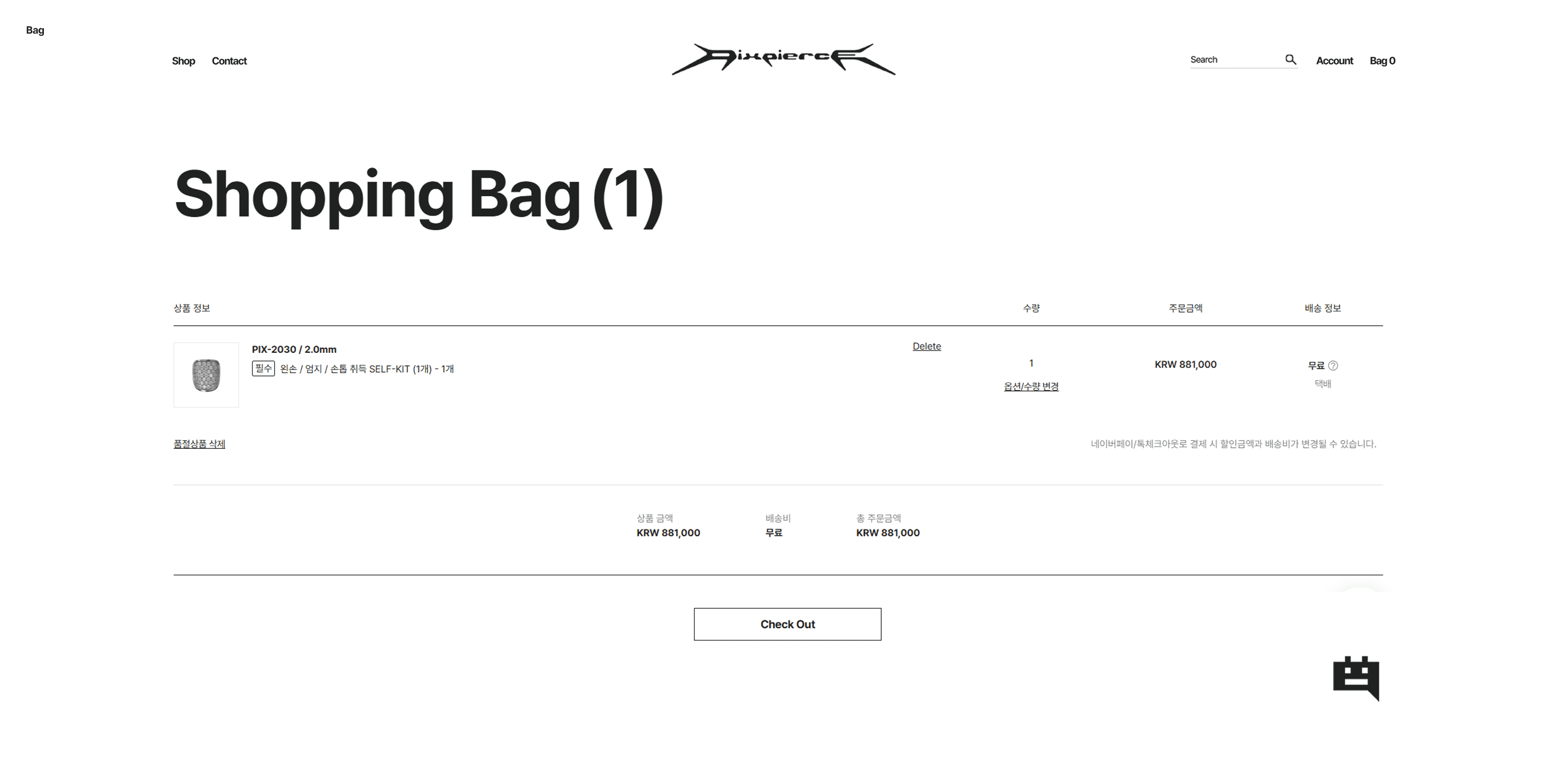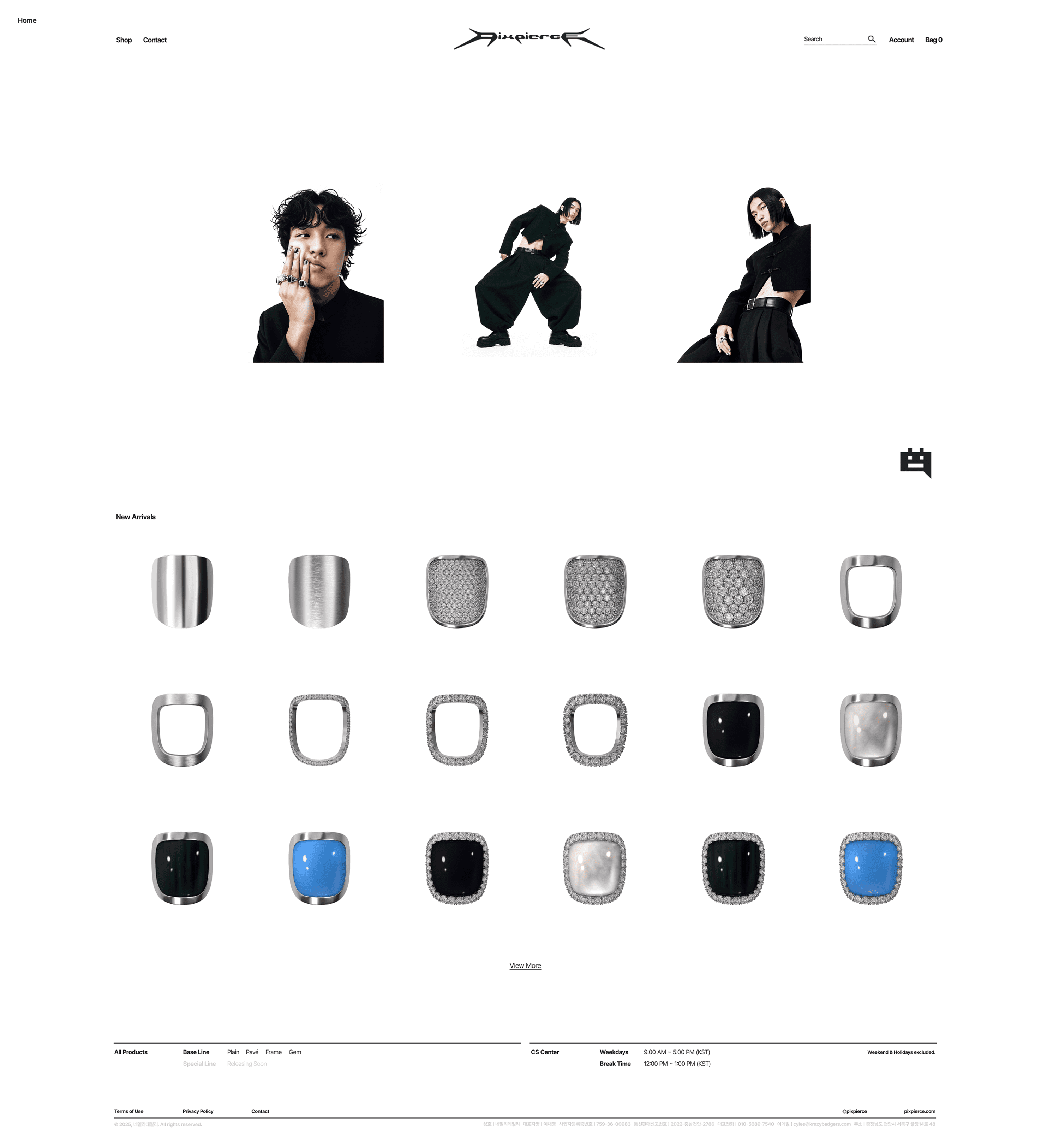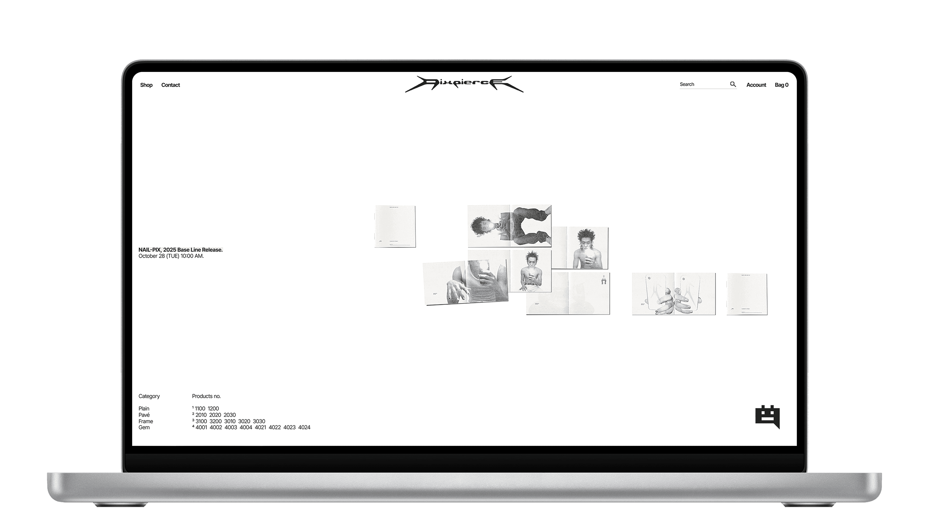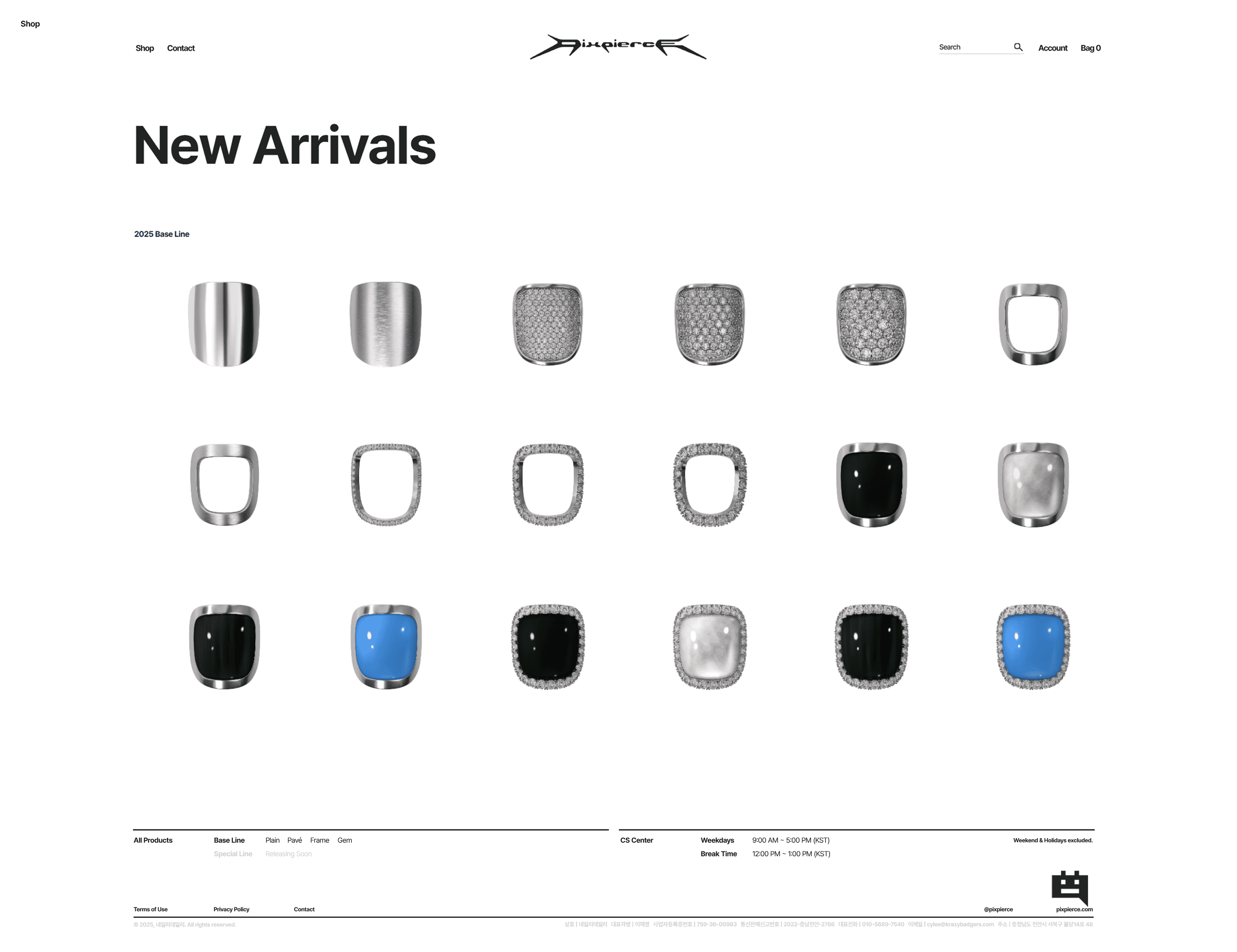PIXPIERCE’s main pages (Home, Product, Store, Account, Order, etc.) are aligned on a standard fixed width of 1920px using a 12-column grid with an 80px gutter. The Home page consists of three sections: [Main Notice (Text) → Sub Notice (Image) → New Arrivals]. Its notable characteristics are that product images or videos do not occupy the entire screen, and the design remains minimal, centered on whitespace and typography. In particular, the first section, Main Notice, is composed mainly of text, but a hover and transition effect is applied so that a representative image expressing the brand’s aesthetic appears. This hover effect provides a sense of reward for mouse movement within the whitespace.