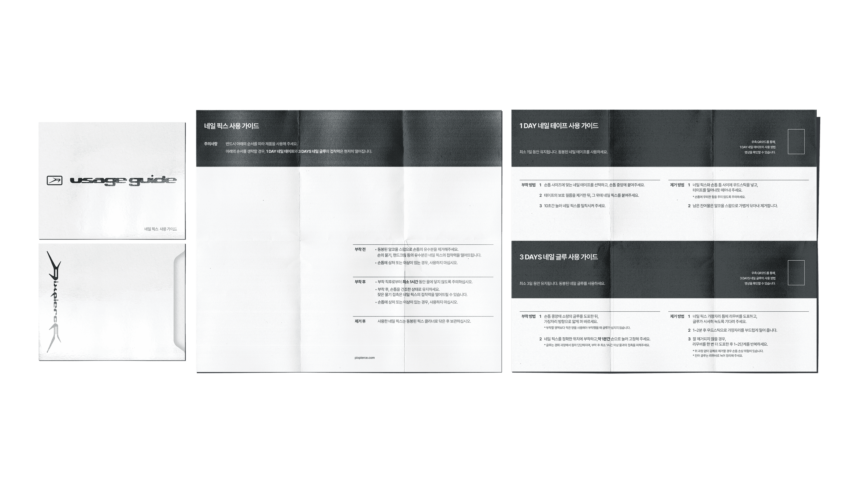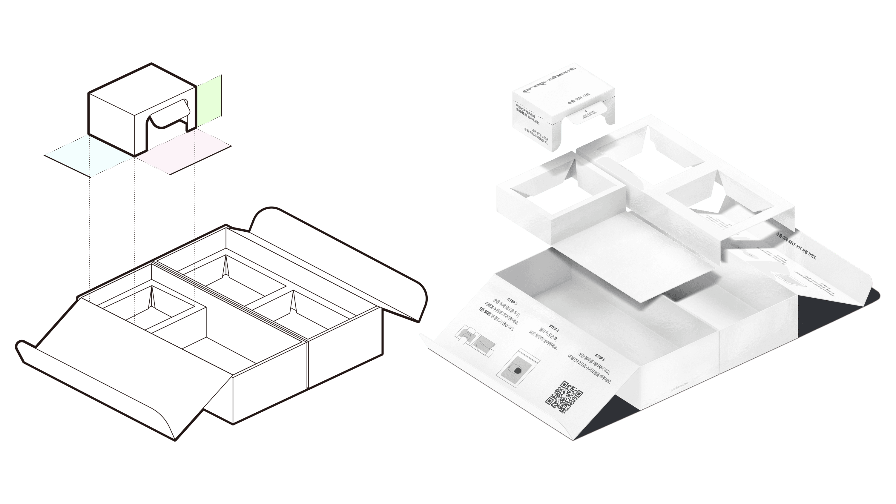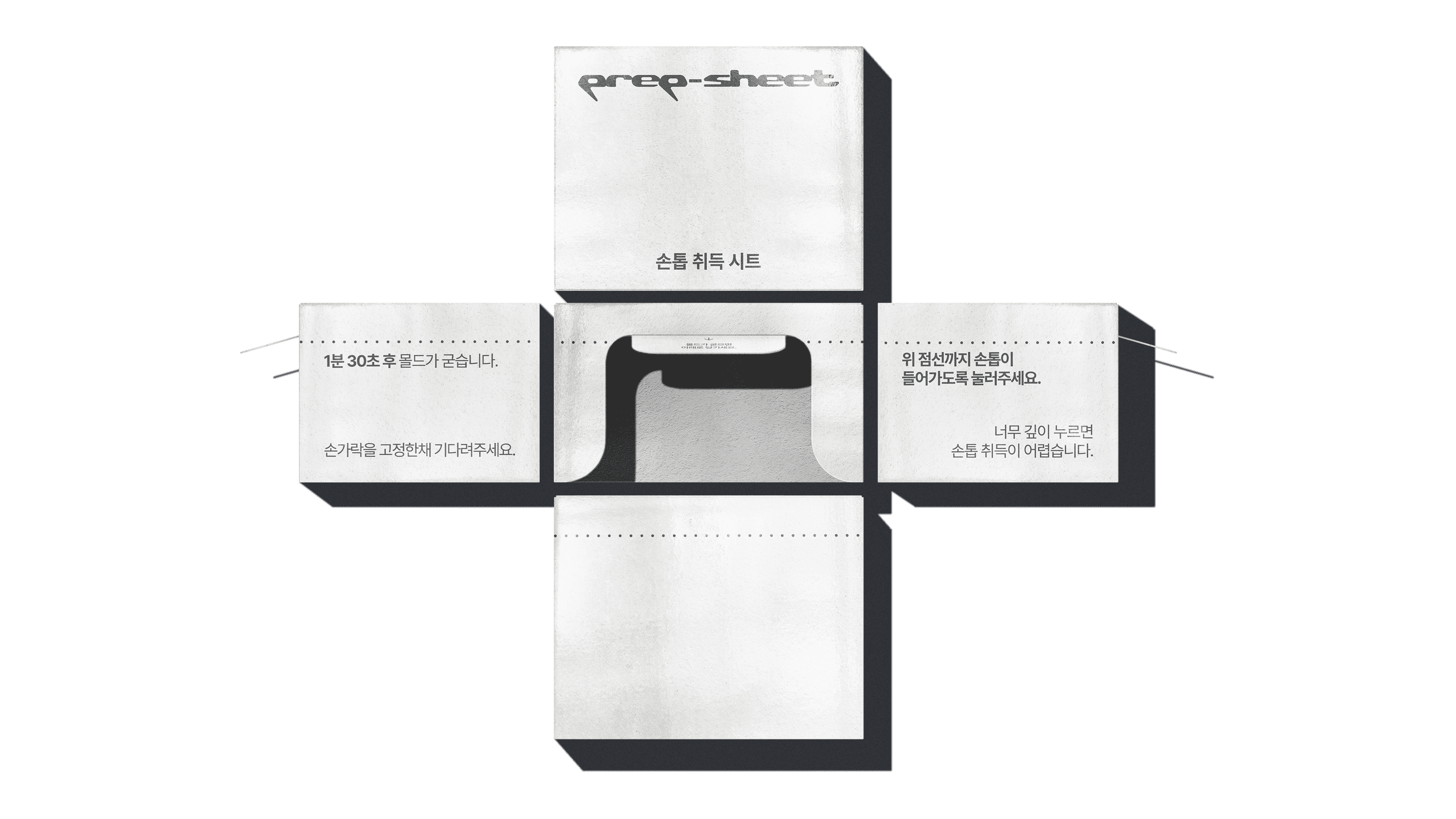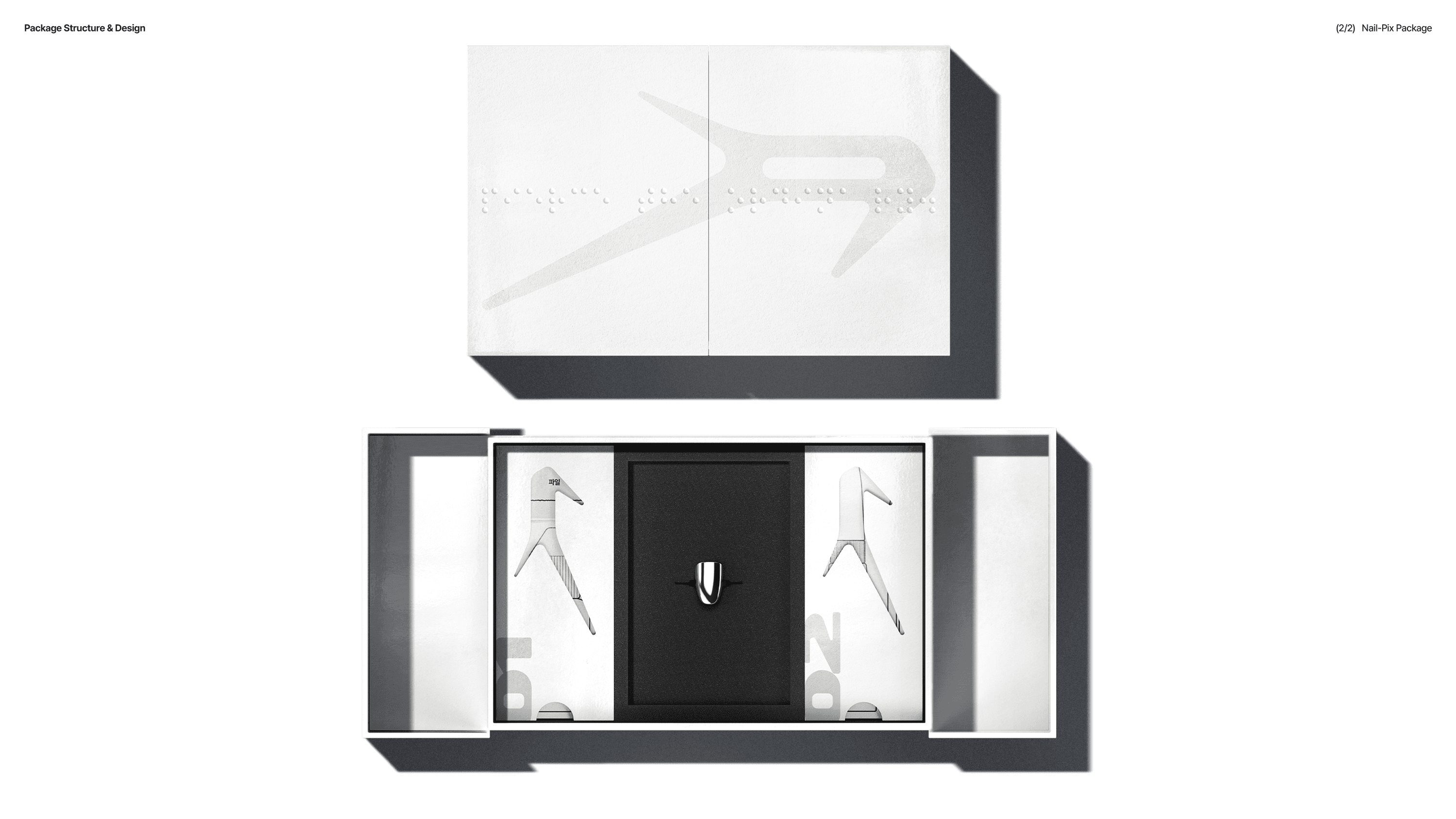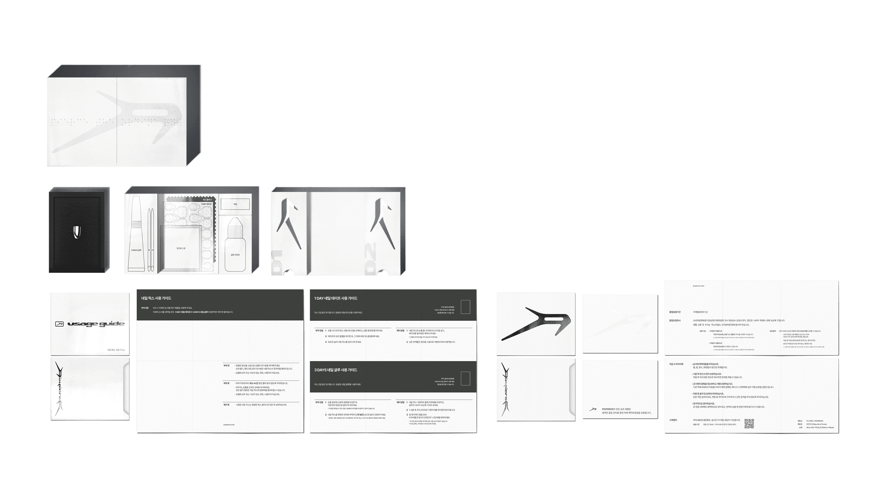One of the components ‘the Prep-Sheet’ received particular attention. We approached this sheet as a UI (User Interface). Within an extremely small area, the key was designing a layout where the user’s flow, eye movement, and hand motion could proceed without errors. In other words, it is a compact paper interface designed with error-minimization as its purpose. Assuming that mistakes are likely during the process, the sheet was built so the user can easily understand the order in which nails should be captured. We structured information by priority and placed text, simplified icons, and illustrations together so the user can act immediately without reading long instructions. The sheet needed to function as an “Easy Doing Tool”, a simple yet functional tool that allows the user to attach and remove the nails correctly, with minimal space allowance and proper grip points. This sheet is an example of true user-based package structure development that prioritizes functionality over aesthetics.