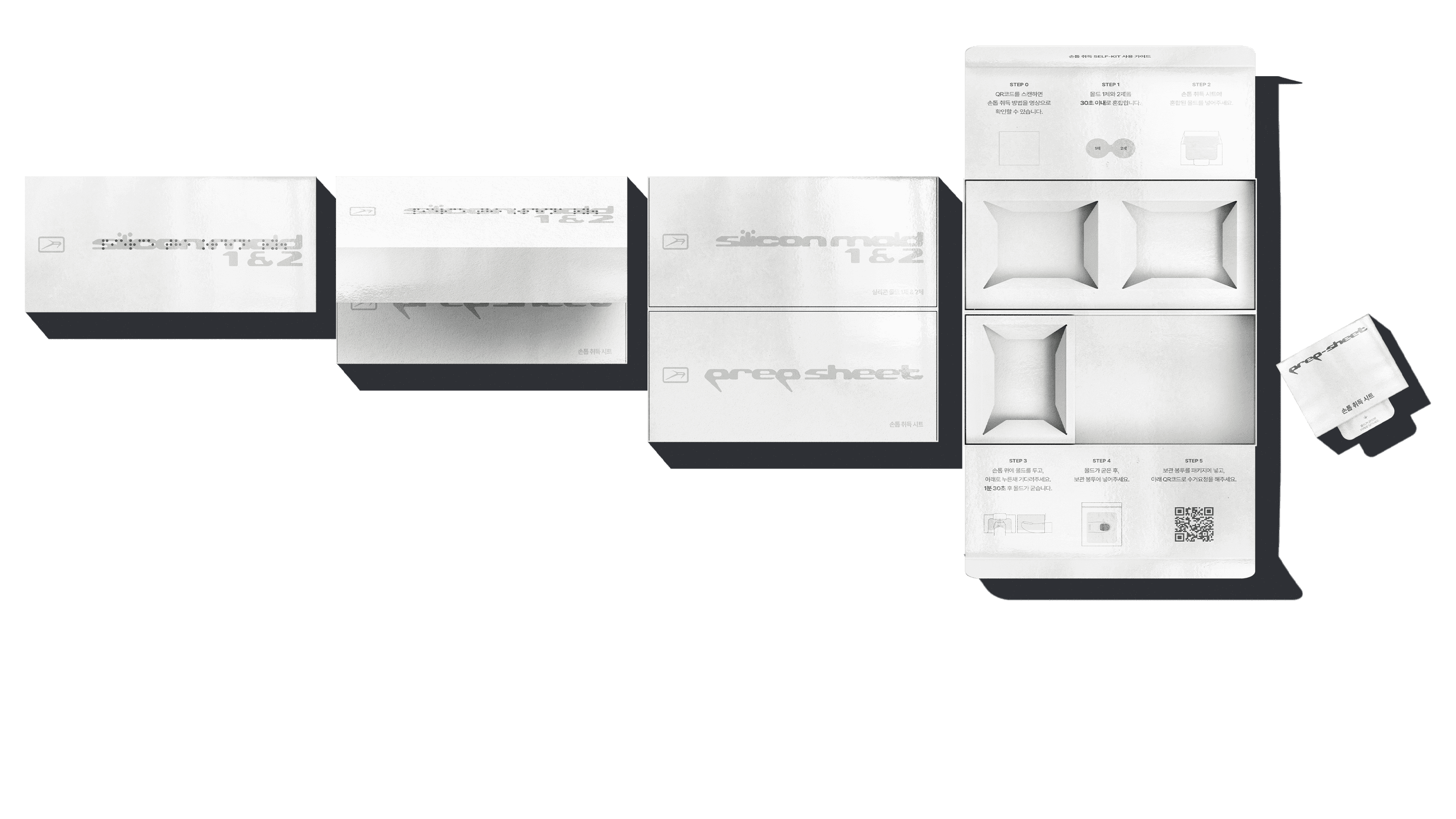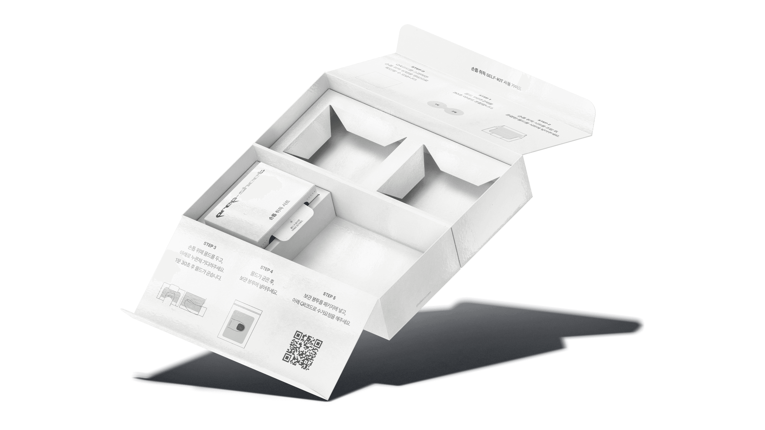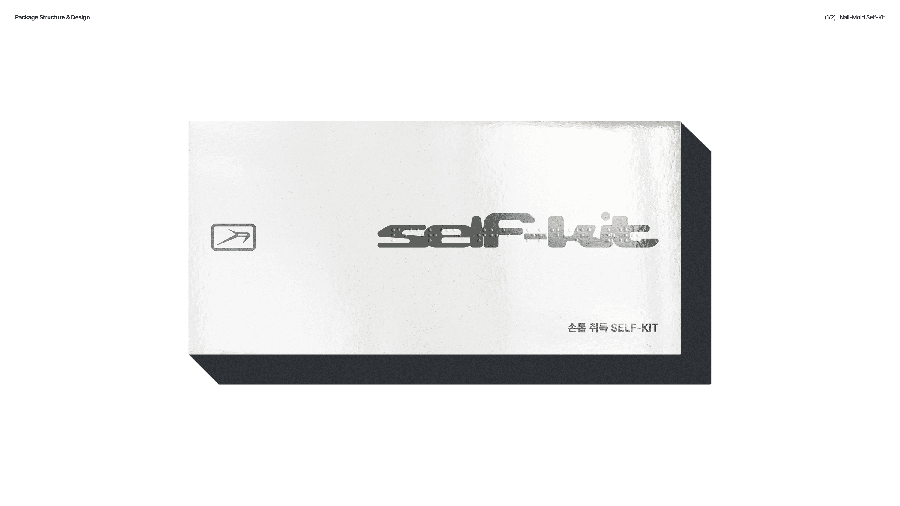 The first package is the Self-Kit, which contains materials that allow customers to capture the shape of their nails. The kit uses a multi-layered mono box combining a dual-lid structure with inserts, and the sequence is clearly designed as [Open → Check → Use]. Instead of a simple open-and-take structure, the box guides the user to follow the steps in order. Inside, the Usage Guide is printed with an intuitive layout featuring step-by-step separation, symmetrical composition, and clear illustrations. All small components are also arranged carefully to stay organized.