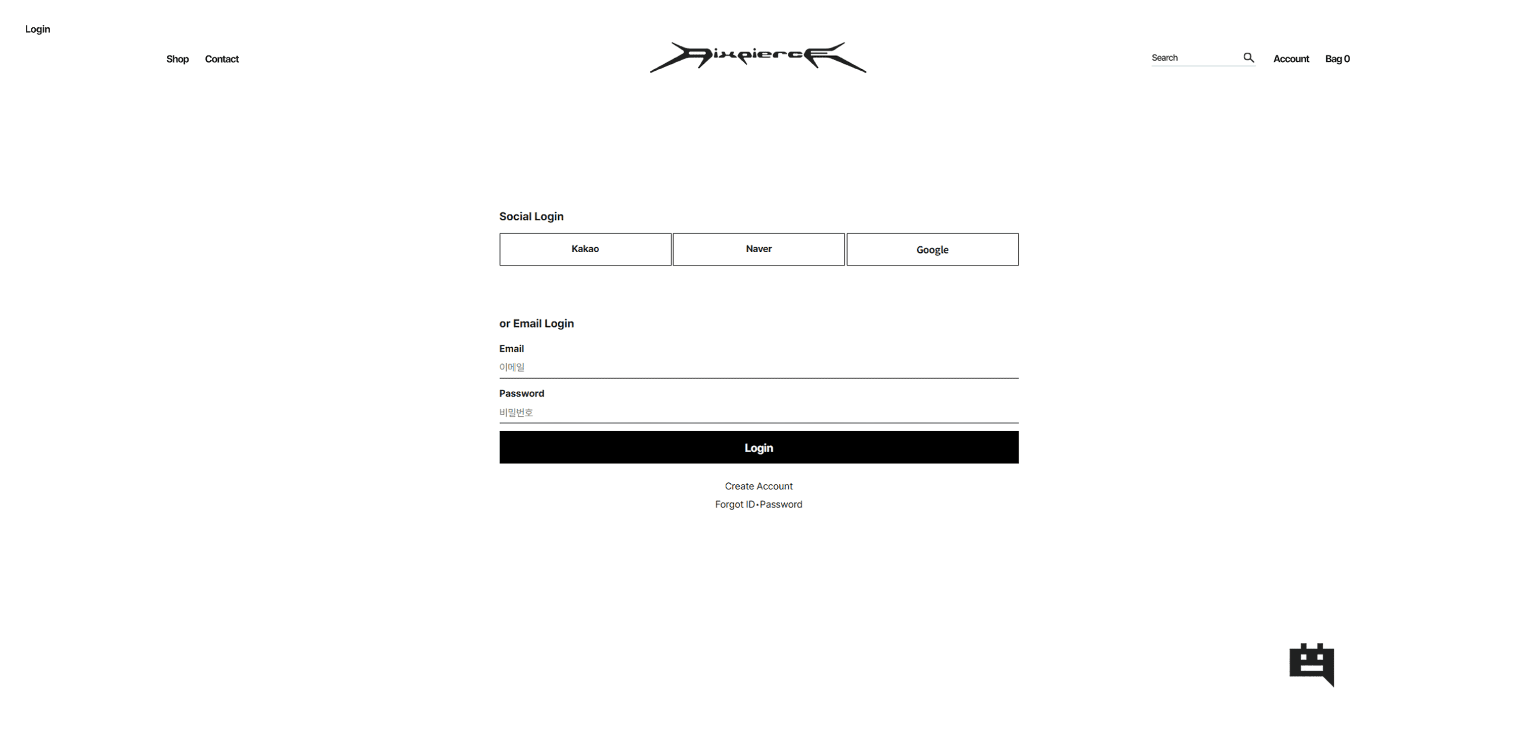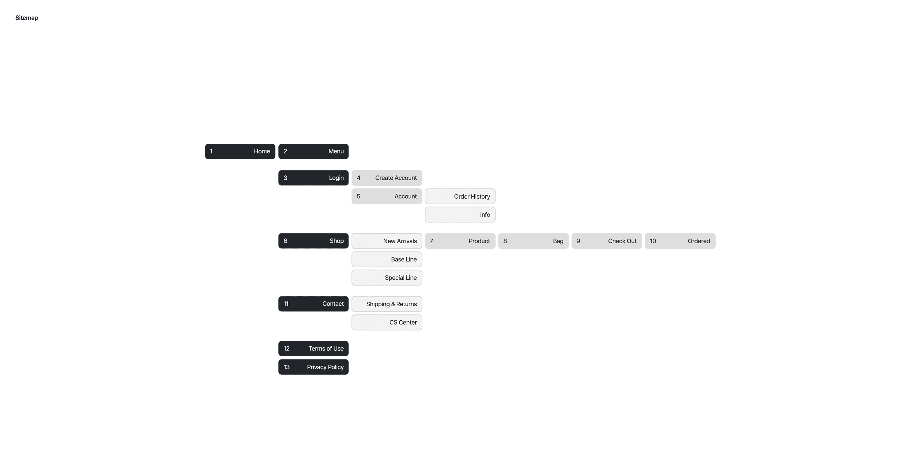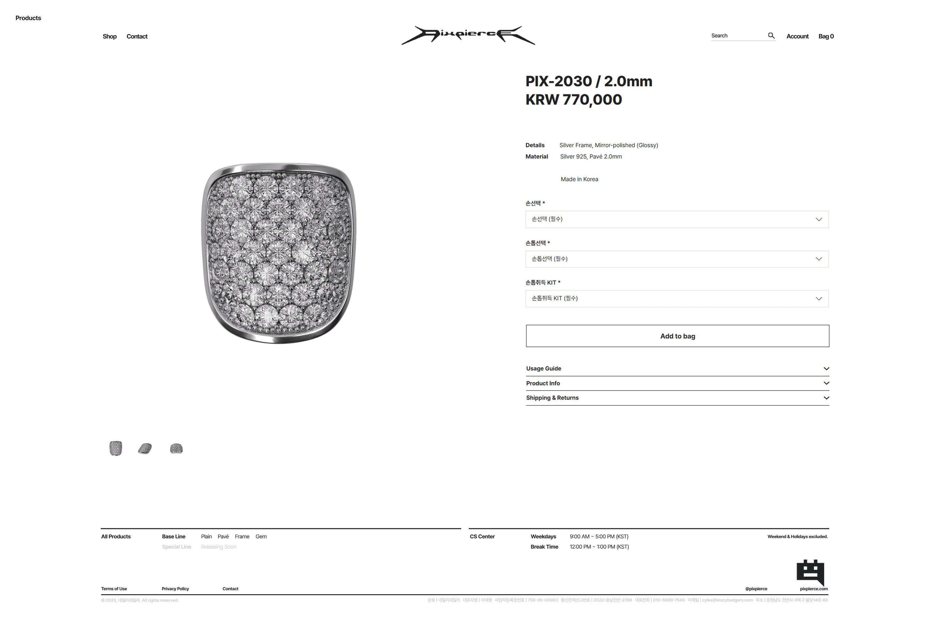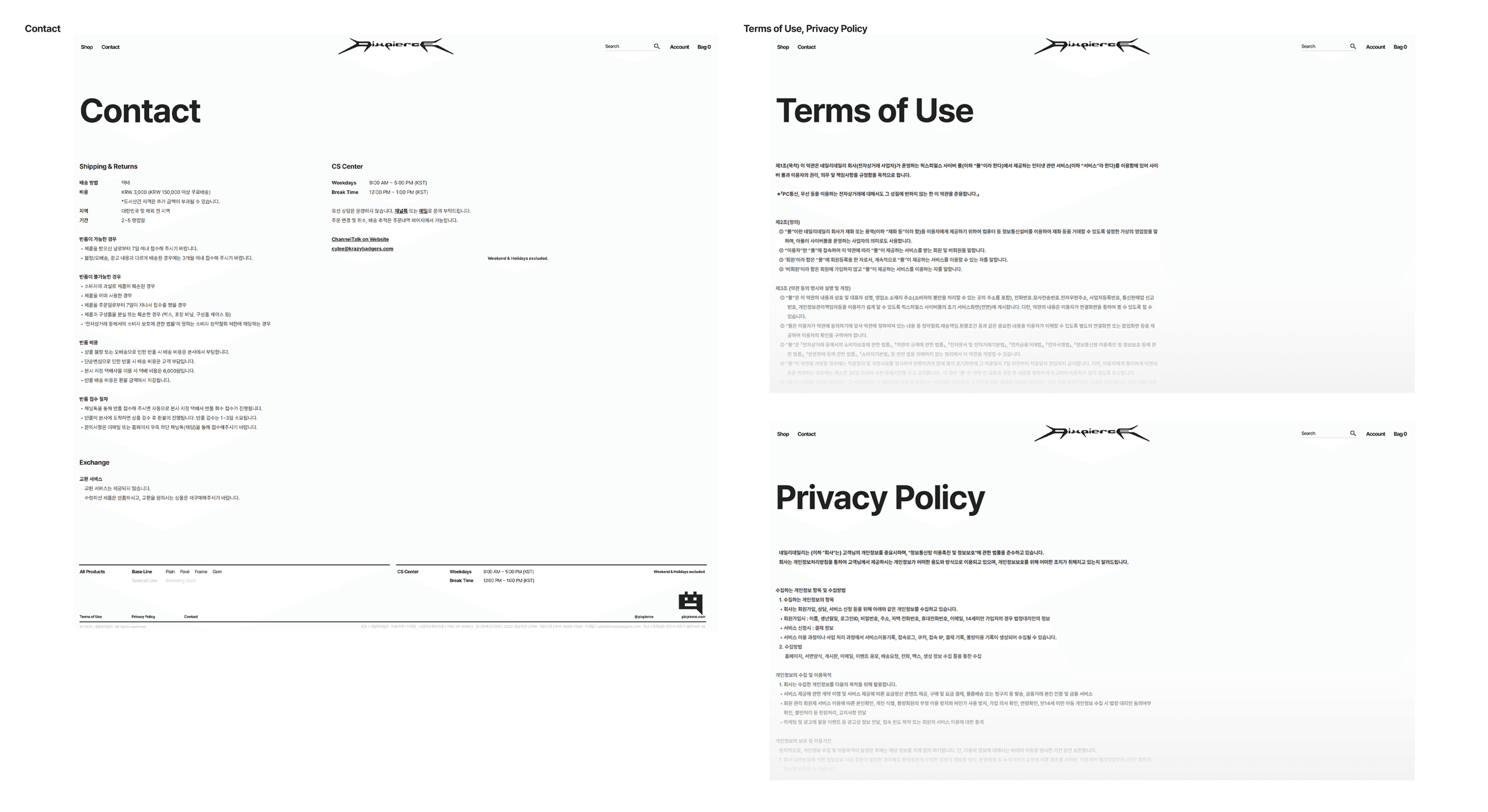 The navigation uses five top menus [Shop / Contact / Search / Account / Bag], with a direct-access structure composed of minimal subcategories. At the bottom of the webpage, the Terms of Use, Privacy Policy, and required information are arranged in a simple layout. The Terms of Use and Privacy Policy pages fully comply with e-commerce standards, while being organized in a way that does not deviate significantly from the overall design direction.
