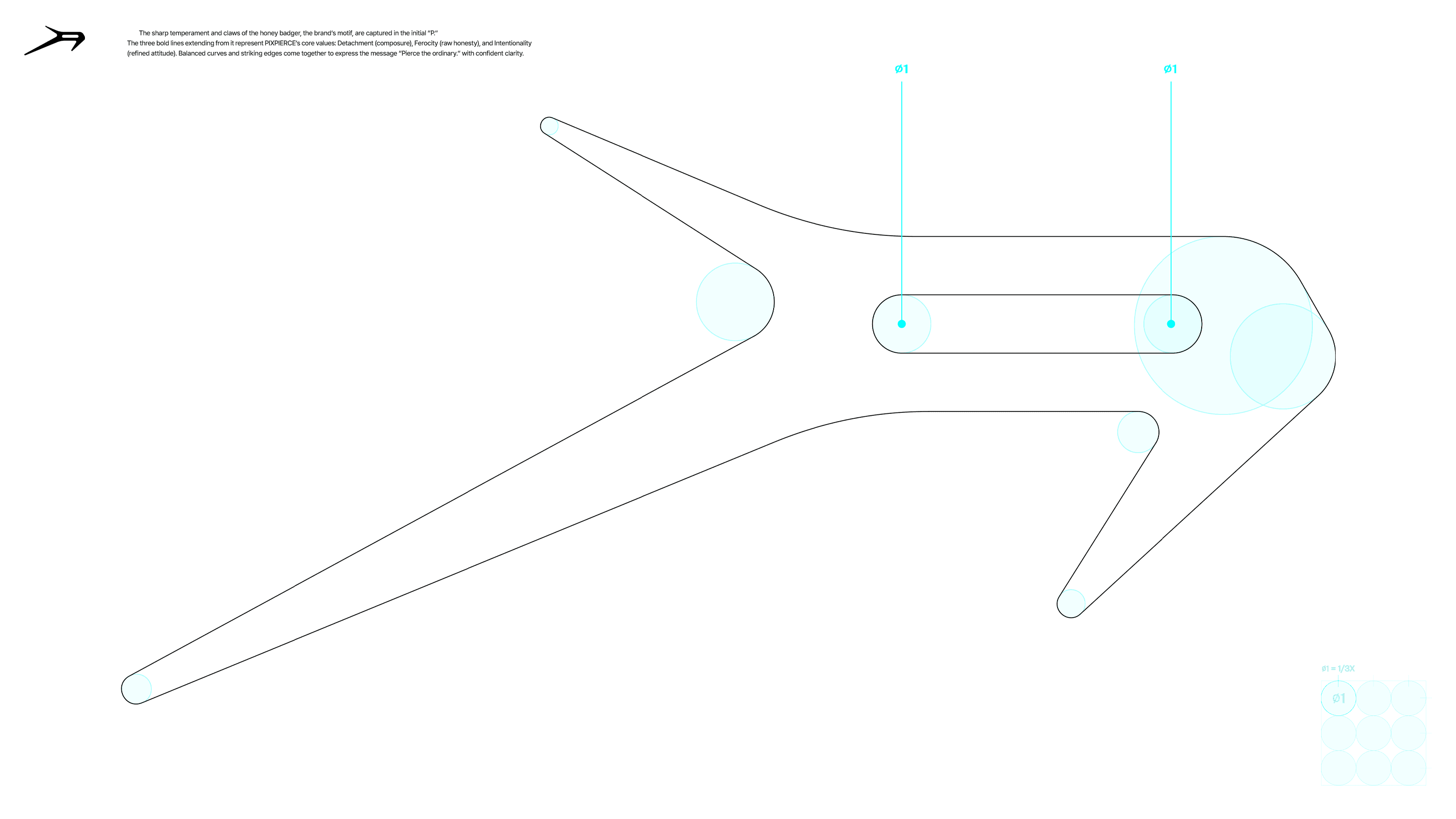 The logo designing began with the wild character of the honey badger, which served as the foundational inspiration for PIXPIERCE at its establishment. We sketched its instinctive and aggressive movement into a three-branch linear form shaped as the letter “P,” completing an initial lettermark representing the Core Values. The coexistence of restrained curves and sharp edges compresses the brand’s slogan “Pierce the Ordinary.” into a visual form. A matching horizontal wordmark was developed accordingly, and both the initial lettermark and wordmark were designed to maintain a consistent impression across different environments.