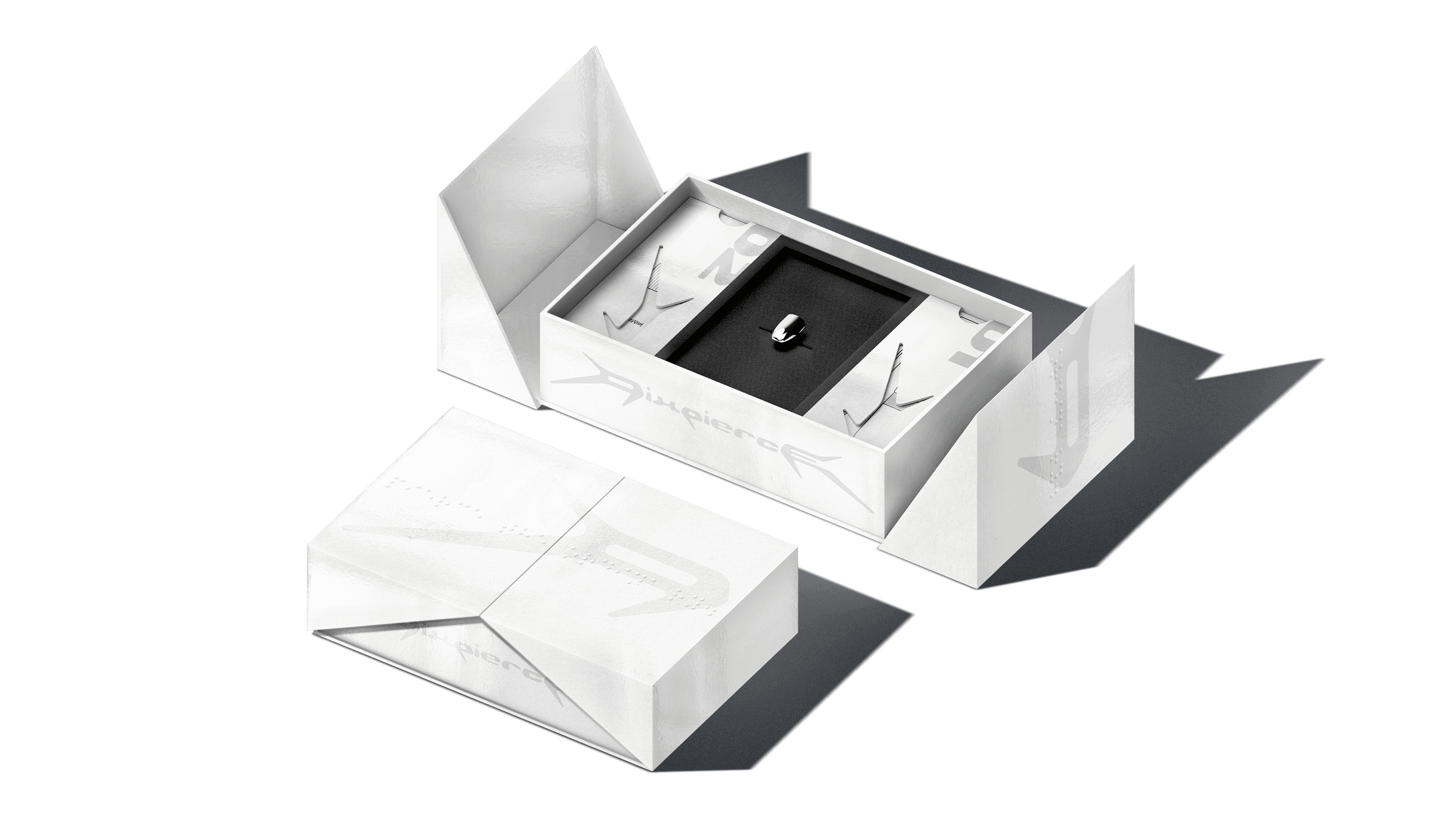 3F On top of the second layer, a sheet cut in the shape of the PIXPIERCE logo is placed to distinguish between layers. Finally, the core product, the ‘Nail-Pix’ is stored here. The Nail-Pix is firmly fixed within a black velvet sponge mold, giving it a floating presence, and the sponge acts as a background color that makes the silver metal material stand out even more.